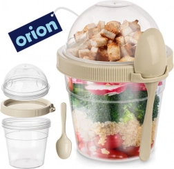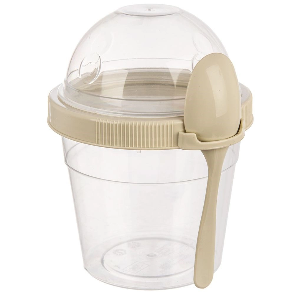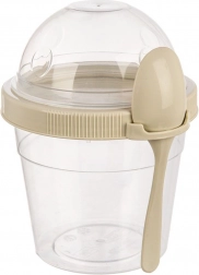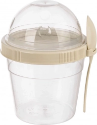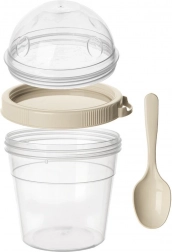 Praktický kelímek na jogurt s oddělenou miskou na müsli a integrovanou lžičkou je ideální na cesty, do práce i do školy. Nabízí kapacitu 400 ml pro jogurt a 150 ml pro křupavé toppingy, těsnící víčko proti vytečení a odolné provedení bez BPA vhodné do myčky, mrazáku i mikrovlnky (bez víčka).