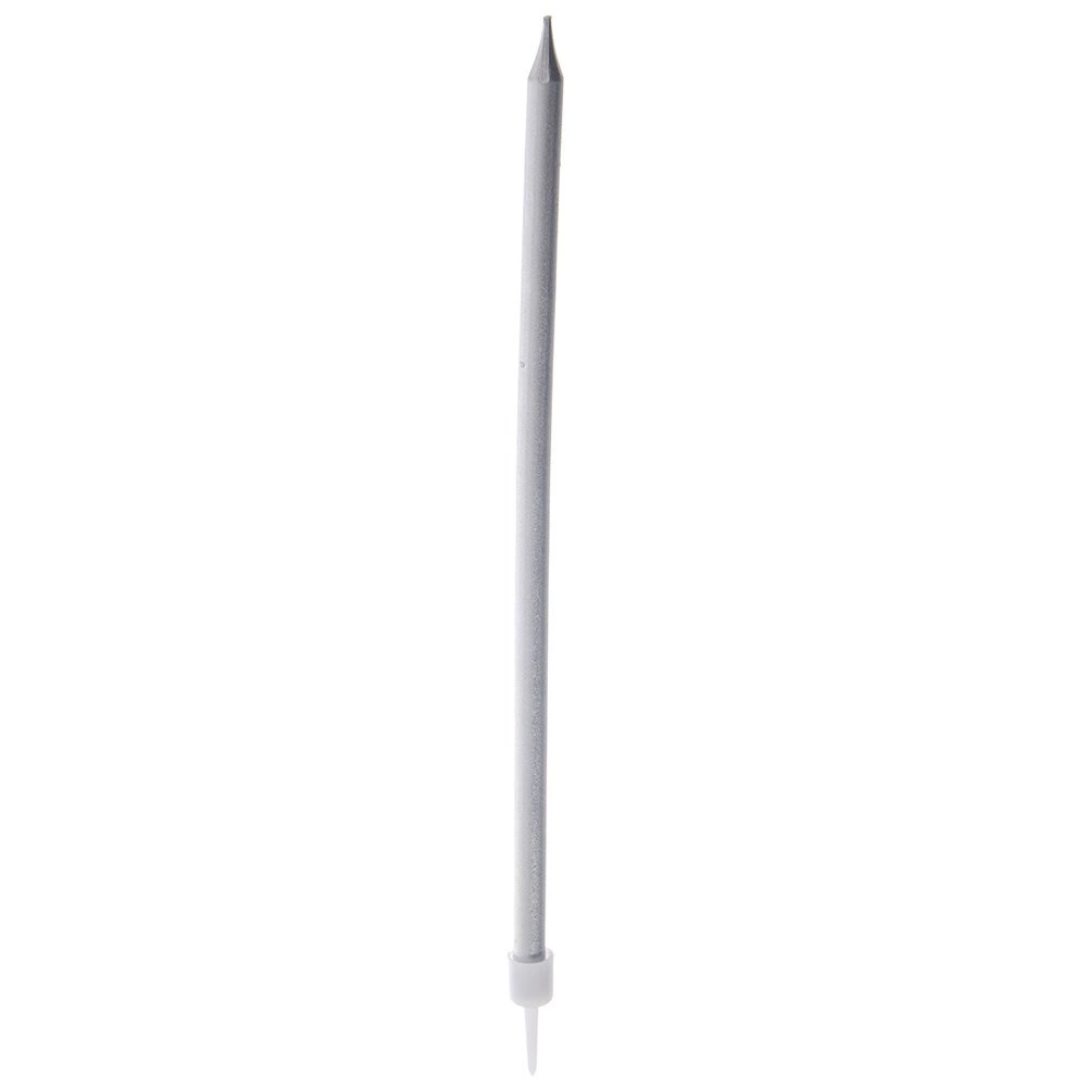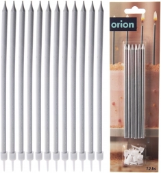 Elegantní sada 12 kusů dlouhých dortových svíček v metalické stříbrné barvě s výškou 14,5 cm pro slavnostní dorty a dezerty. Součástí jsou bílé plastové stojánky pro stabilní uchycení. Svěží design a efektní výška dodají každé oslavě výjimečný vzhled. Univerzální stříbrná barva se hodí ke každému dortu.