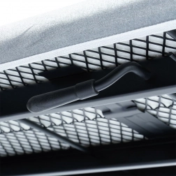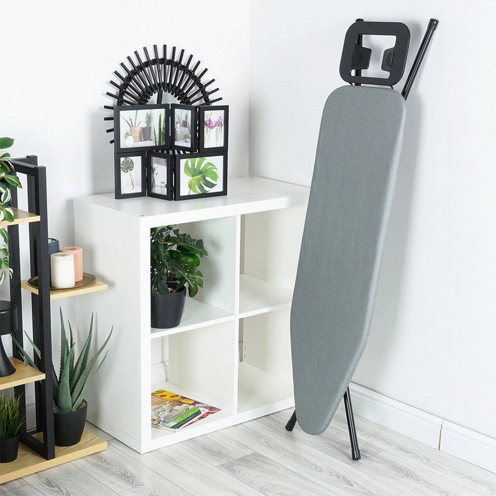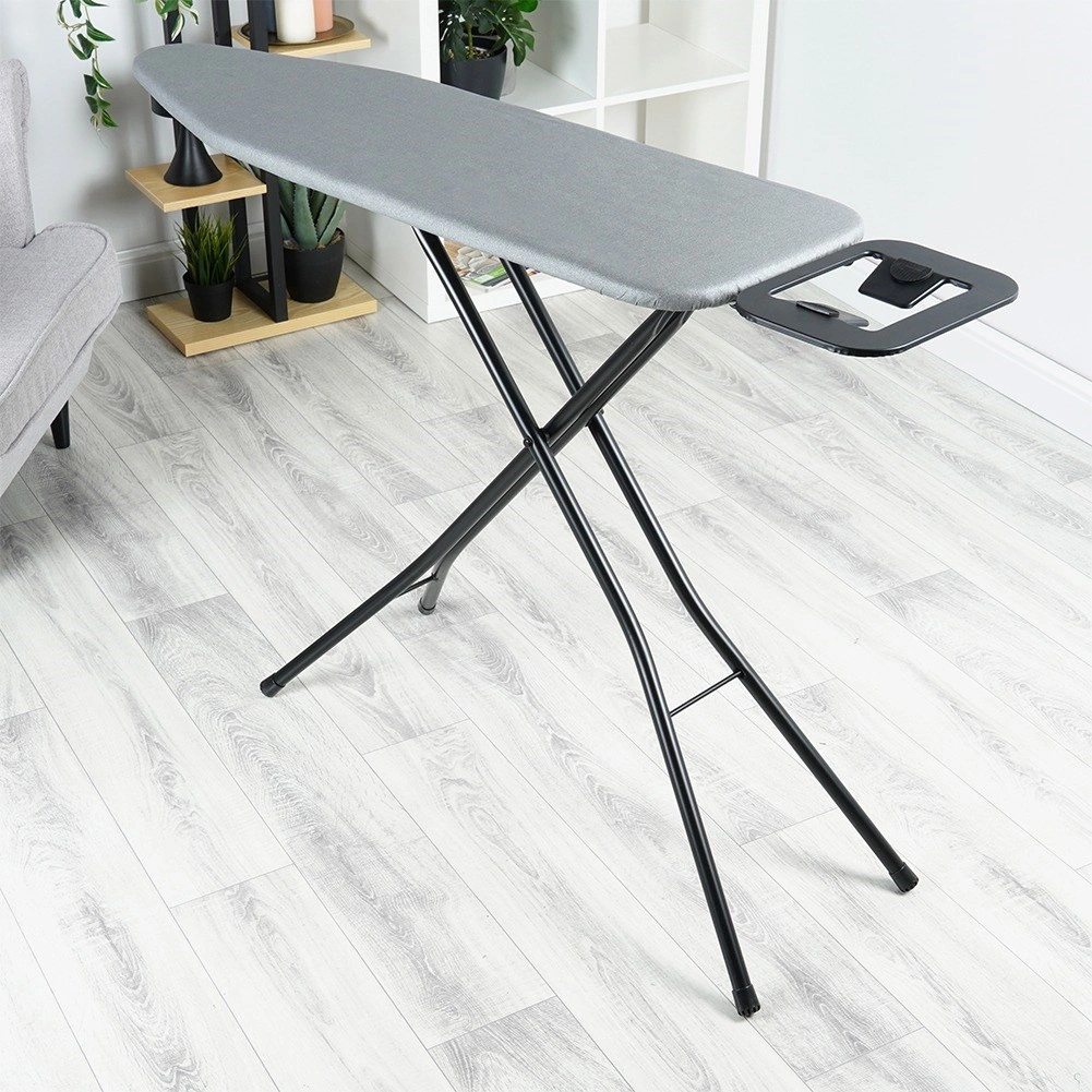 Užijte si komfortní žehlení díky robustní konstrukci z práškově lakovaného kovu a velké ploše 110 × 34 cm, která je ideální i pro větší kusy prádla, jako je ložní povlečení či závěsy. Integrovaná odkládací plocha na žehličku s tepelně odolnými gumovými prvky zvyšuje bezpečnost a plynulost práce.