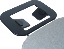 Práškově lakovaný kov zaručuje pevnost a dlouhou životnost. Integrovaná odkládací plocha s tepelně odolnými gumovými prvky drží žehličku bezpečně na místě.