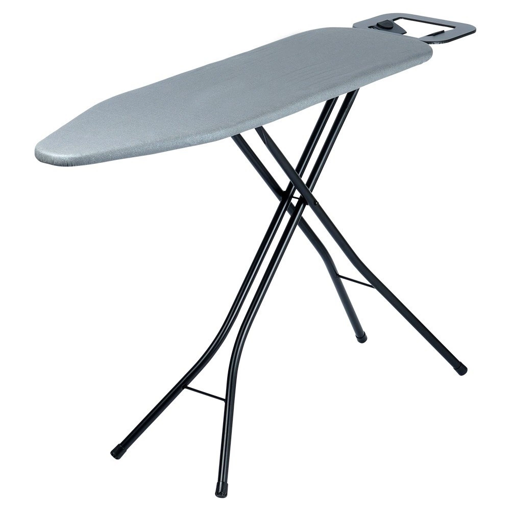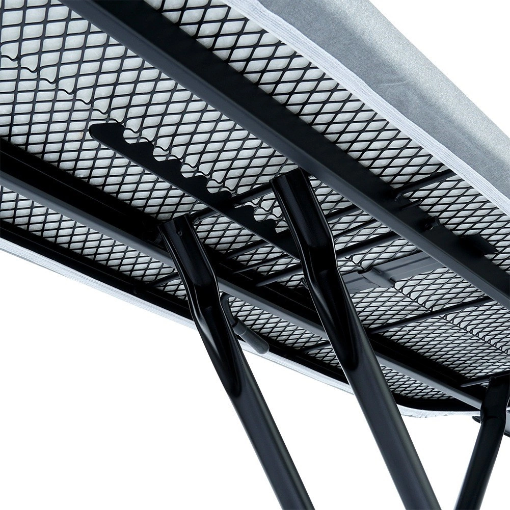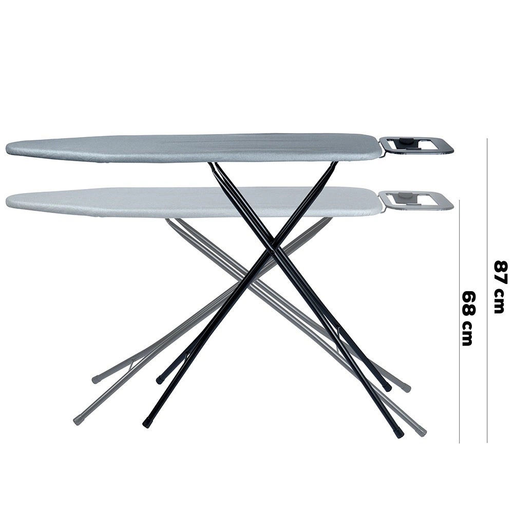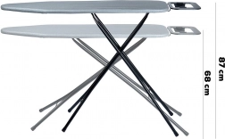 7stupňové nastavení výšky v rozmezí 68–87,5 cm umožňuje žehlit vsedě i vestoje, čímž šetří záda a minimalizuje únavu. Síťovaná spodní deska podporuje efektivní prostup páry a je tak ideální pro parní žehlení. Stabilní nohy s protiskluzovými koncovkami chrání podlahu a brání nežádoucímu posunu.