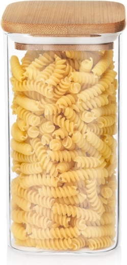 Čtvercový půdorys (10,5 × 10,5 × 21 cm) šetří místo v policích a spíži a pomáhá s přehlednou organizací. Dóza je univerzální pro suché suroviny — kávu, cukr, sůl, těstoviny, luštěniny, müsli, sušené houby či sladkosti. Skleněné tělo lze mýt v myčce (víčko doporučujeme omývat ručně).