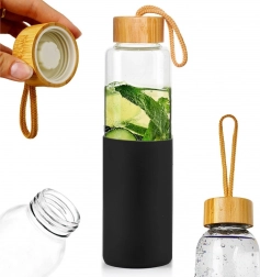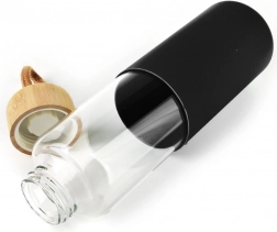 Praktická skleněná láhev o objemu 600 ml s bambusovým víčkem a textilní smyčkou na nošení je ideální pro každodenní pitný režim. Je vyrobena z odolného borosilikátového skla, takže je vhodná pro teplé i studené nápoje. Silikonový ochranný obal v černé barvě zlepšuje úchop a chrání před rozbitím, zatímco těsnicí silikonové kroužky ve víčku zajišťují spolehlivou nepropustnost.