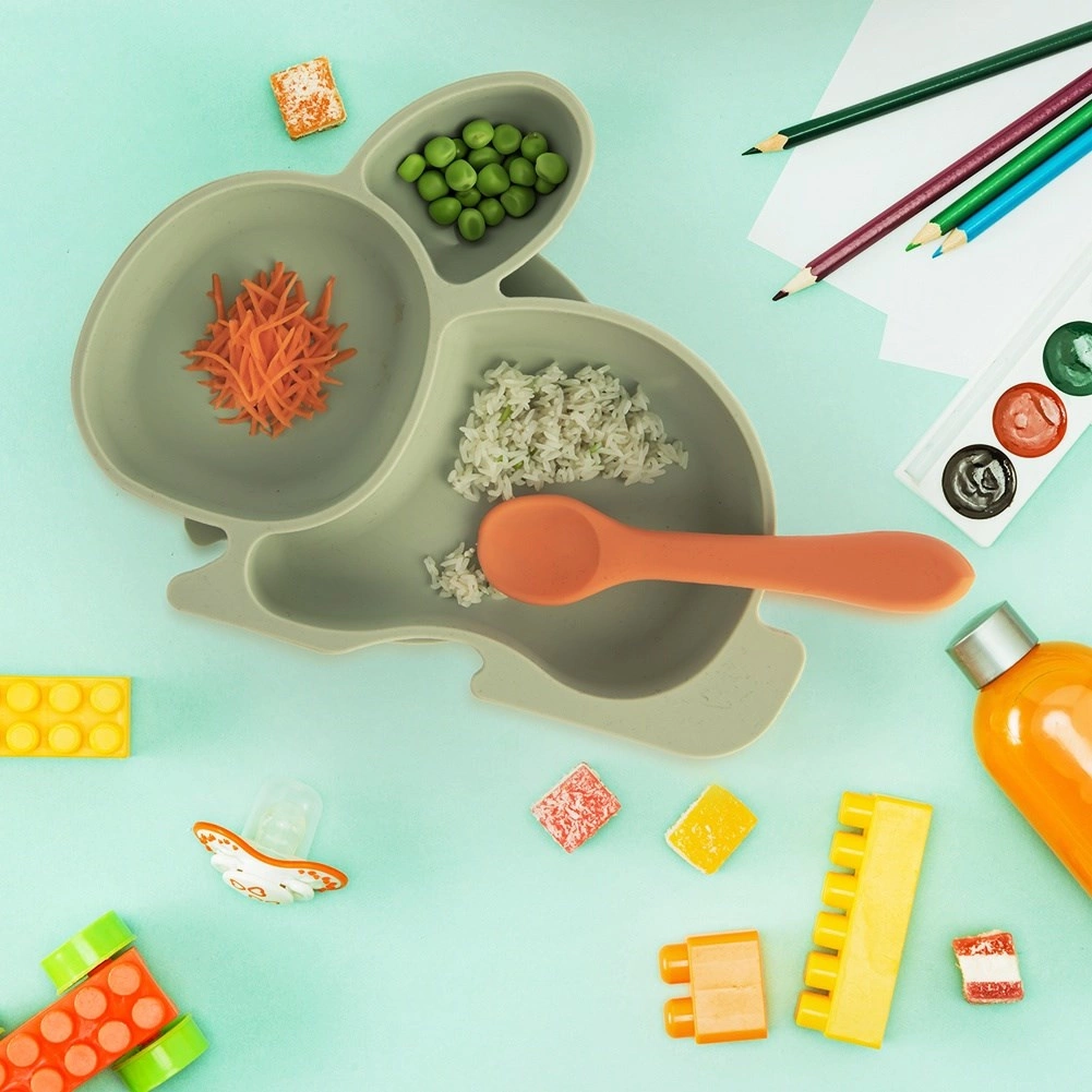 Praktický dětský talířek se třemi přihrádkami ve tvaru zajíčka pro pohodlné servírování jídel a svačinek. Díky silné přísavce pevně drží na stole, odolá teplotám od -20 °C do +120 °C a je vhodný do myčky, mikrovlnky i mrazáku. Vyroben z kvalitního silikonu v zelené barvě.