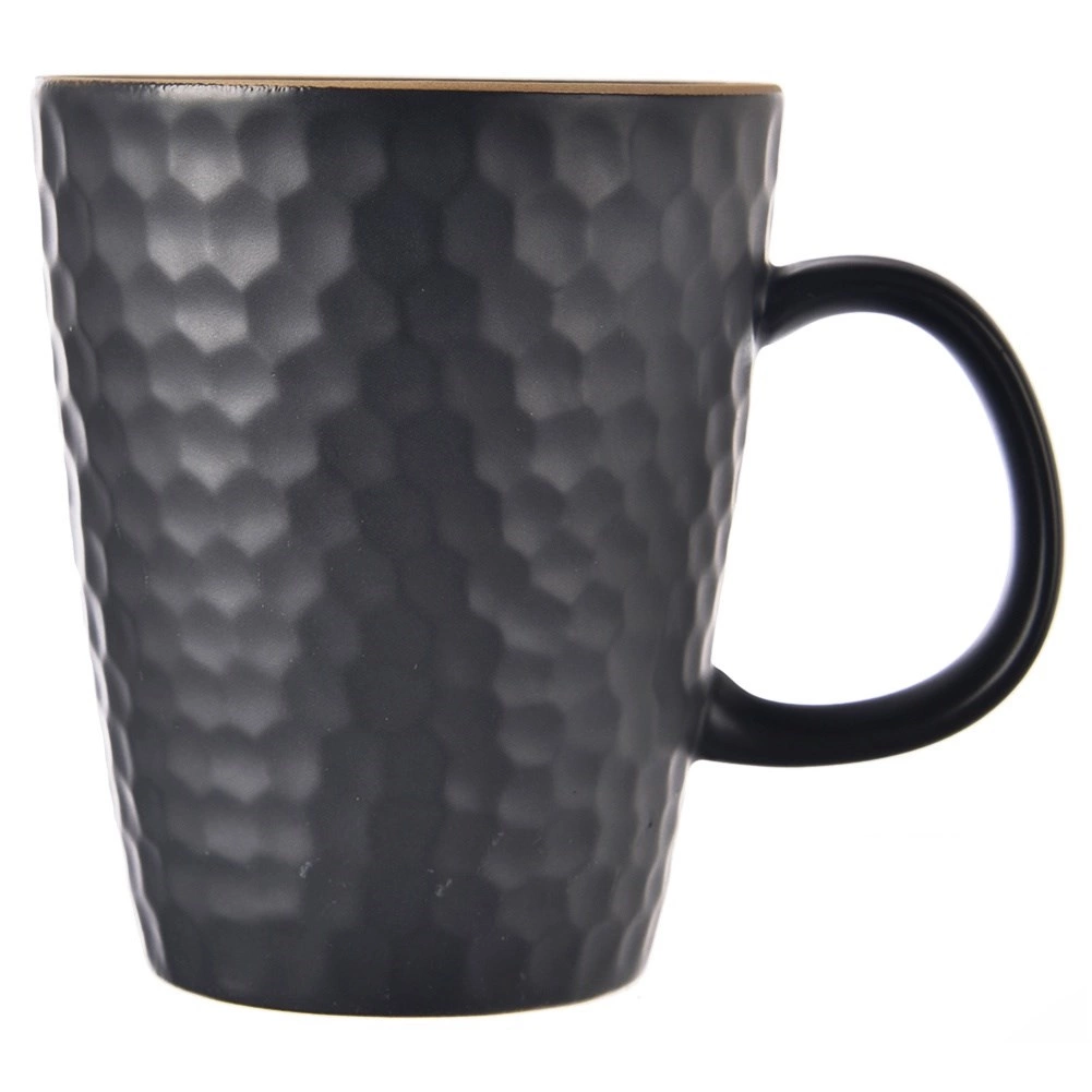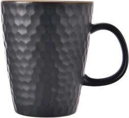 Stylový černý hrnek z kvalitní kameniny o objemu 420 ml s reliéfem připomínajícím včelí plástve. Nabízí pohodlné ucho, moderní matný vzhled a je vhodný do myčky i mikrovlnky – ideální pro každodenní kávu, čaj i kakao.