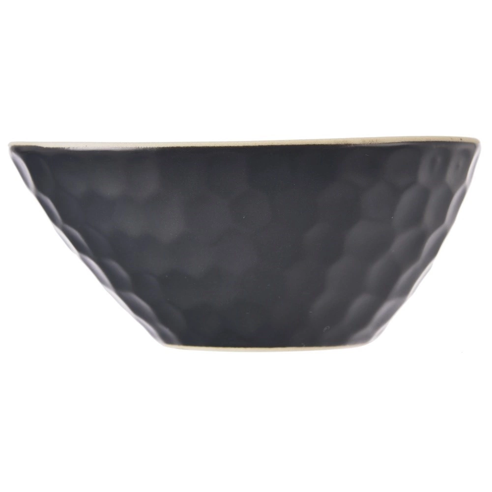 Elegantní miska z kvalitní kameniny v černé barvě je perfektní pro každodenní servírování i slavnostní příležitosti. Díky praktickým rozměrům 11 × 8,5 × 4,5 cm pohodlně naservírujete oříšky, sušené ovoce, olivy, malé saláty i dezerty. Povrch s efektem plástve dodává originální vzhled a zároveň příjemně padne do ruky.