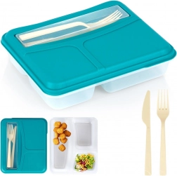 Tento kompaktní lunchbox s rozdělením na 3 části udrží hlavní jídlo, salát i snack přehledně oddělené. Víko v tyrkysové barvě ukrývá praktické příbory – nůž a vidličku – takže máte vše po ruce, ať jste kdekoli. Bezpečné provedení bez BPA je šetrné ke zdraví i potravinám.