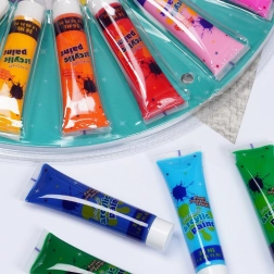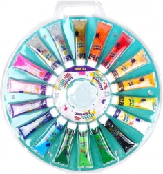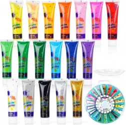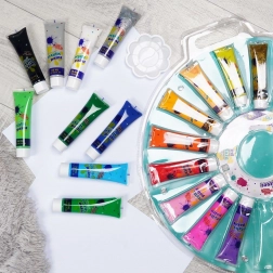 V balení najdete 18 odstínů včetně zlaté se třpytkami, stříbrné se třpytkami, neonového a perleťového tónu – vše připravené k míchání na přiložené paletce. Akryly skvěle přilnou k různým povrchům a po zaschnutí jsou odolné a stálobarevné.