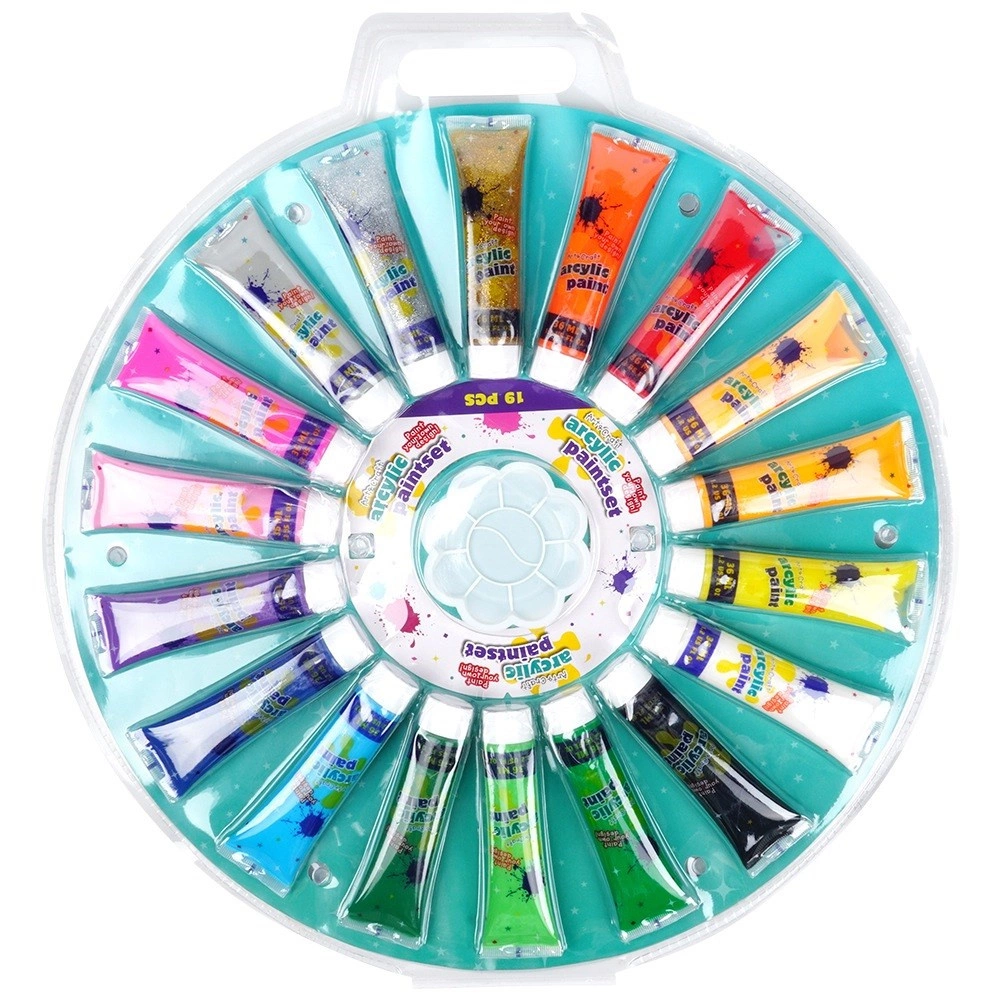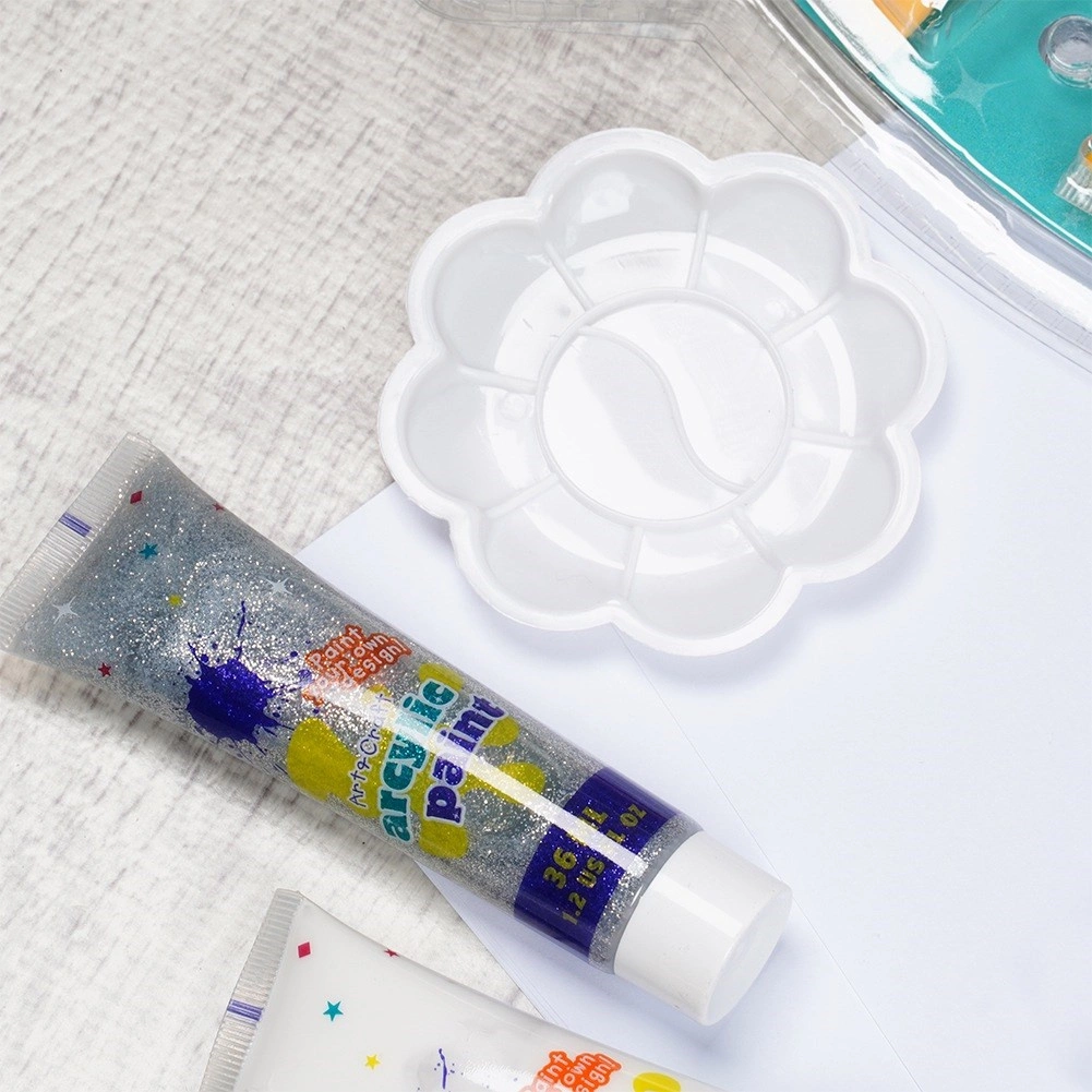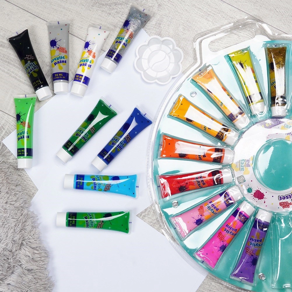 Objevte univerzální sadu akrylových barev pro kreativní projekty: 18 barev v praktických tubách po 36 ml a plastová paletka pro míchání odstínů. Barvy mají intenzivní a trvalé pigmenty, výborné krytí a hodí se na papír, plátno, dřevo i textil. Součástí jsou i metalické, perleťové, neonové a třpytivé varianty pro efektní výsledky.