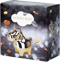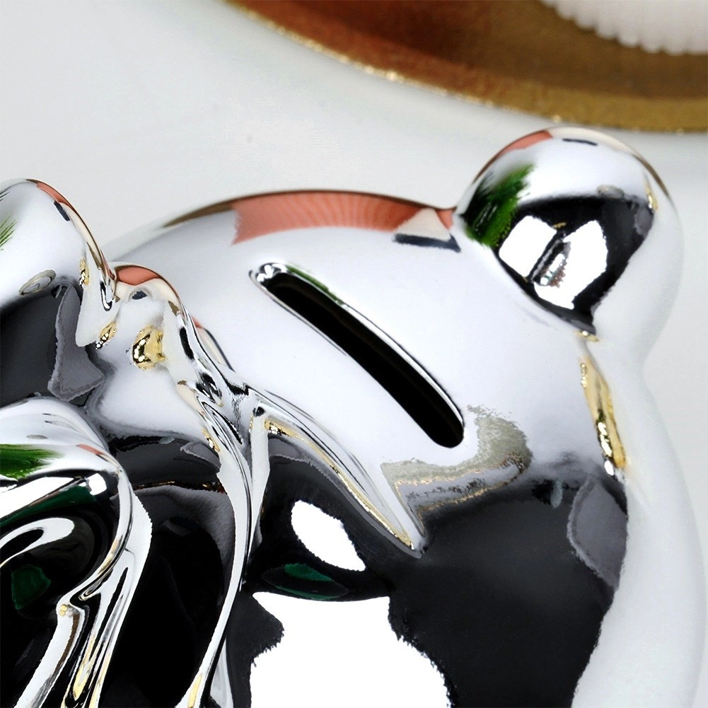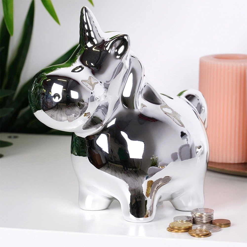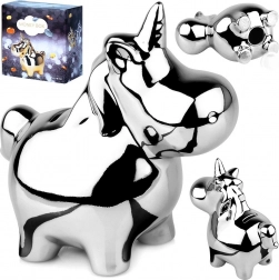 Tato keramická pokladnička jednorožec vyniká zrcadlovým stříbrným povrchem, který dodá vašemu domovu nádech glamour. S rozměry 18 × 10,5 × 18 cm nabízí dostatek prostoru pro drobné mince i složené bankovky, přičemž stabilně stojí na polici, komodě či pracovním stole.