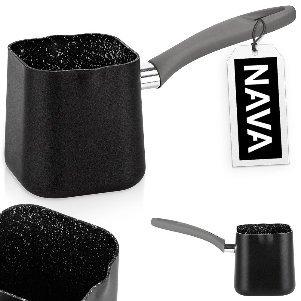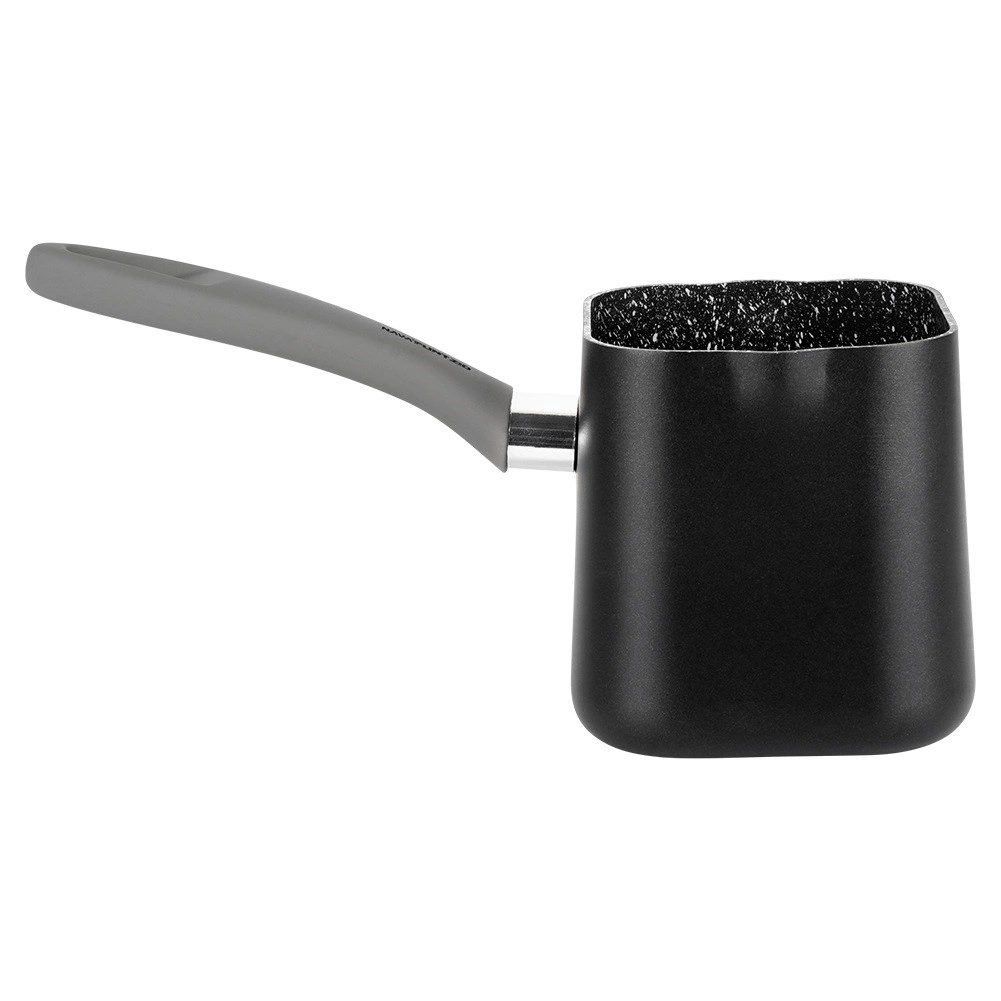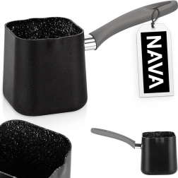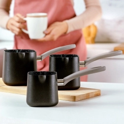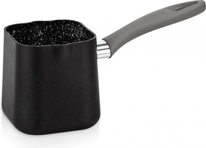 Objevte elegantní džezvu pro tureckou kávu, která kombinuje moderní design a každodenní praktičnost. Hliníkové tělo s granitovou nepřilnavou vrstvou zajistí rovnoměrné zahřívání, odolnost proti poškrábání a snadné čištění. Matně černý vnějšek a uvnitř černý krémový „speckled“ povrch podtrhují prémiový vzhled.