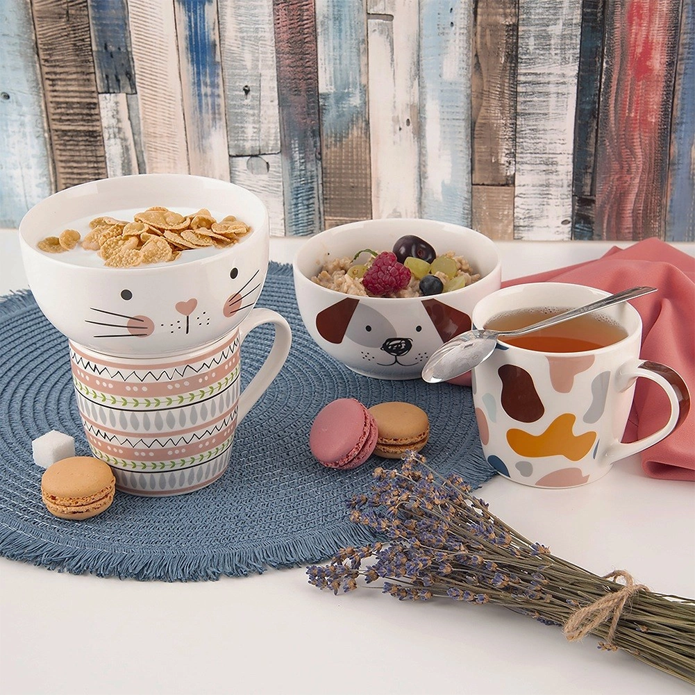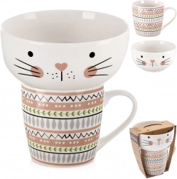 Udělejte si radost stylovým servírováním snídaně. Tento porcelánový set s roztomilou kočičí tváří propojuje hrnek a misku do hravého celku – potěší děti i dospělé. Kvalitní porcelán s hladkou, lesklou glazurou je příjemný na dotek, odolný při každodenním použití a snadno se udržuje.