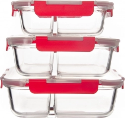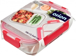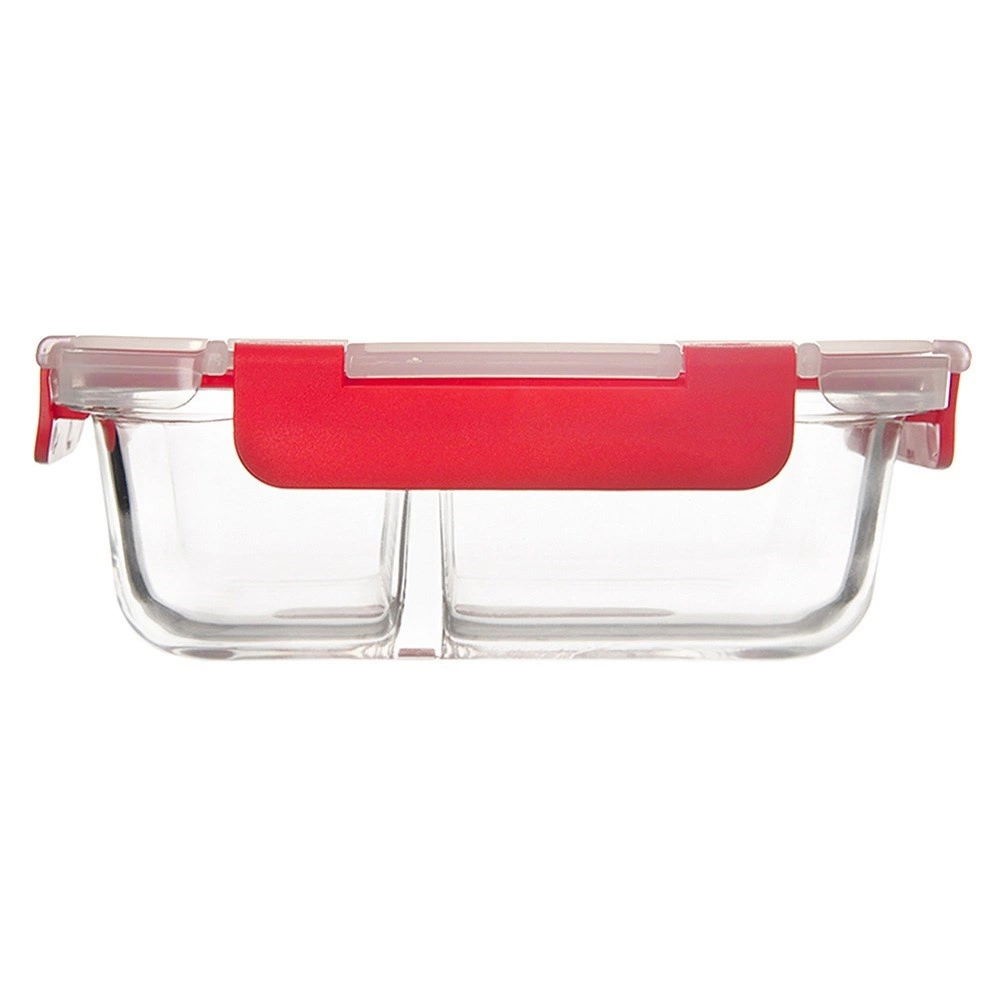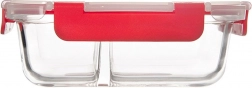 Praktický skleněný jídelní box s dvěma přihrádkami a vzduchotěsným víkem na čtyři zámky udrží jídlo čerstvé, oddělené a bezpečně přenosné. Odolné borosilikátové sklo zvládne mráz, mikrovlnku i troubu (bez víka), silikonové těsnění brání únikům a mísení chutí. Ideální do práce, do školy i na cesty.