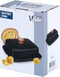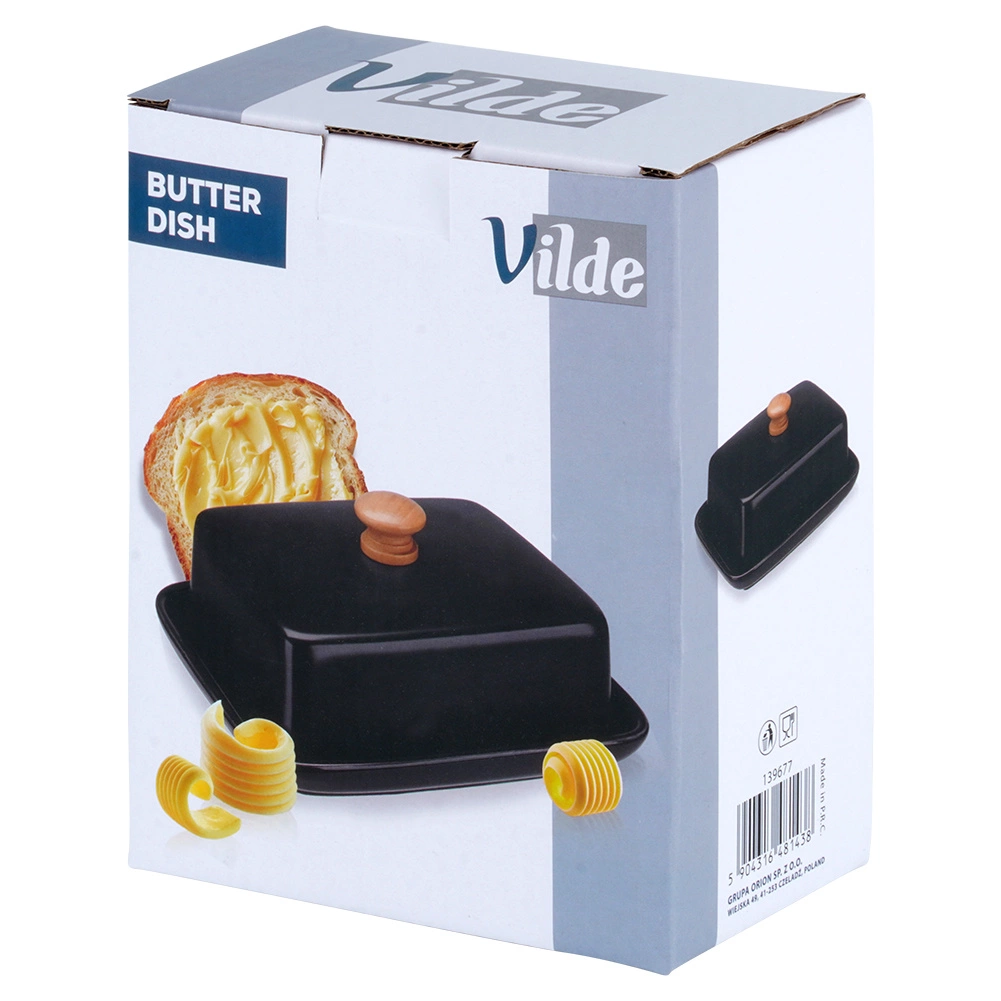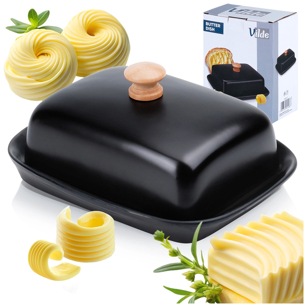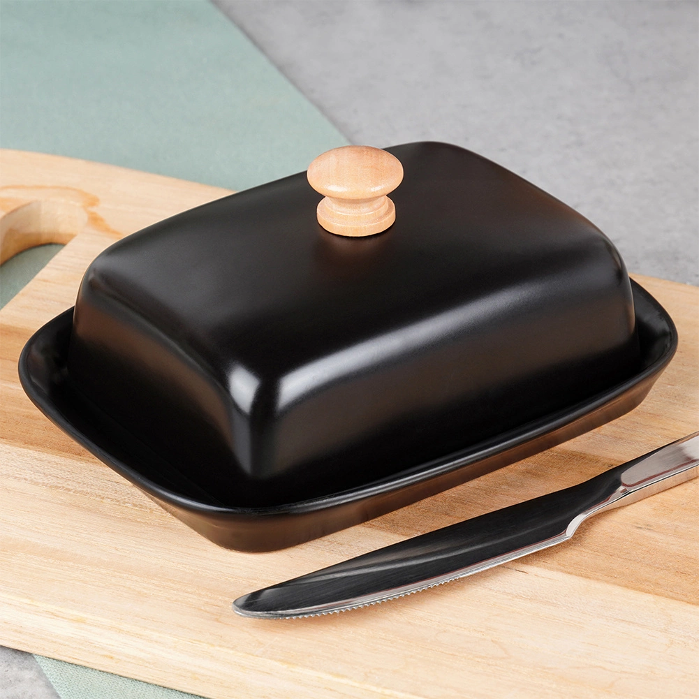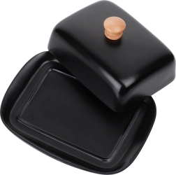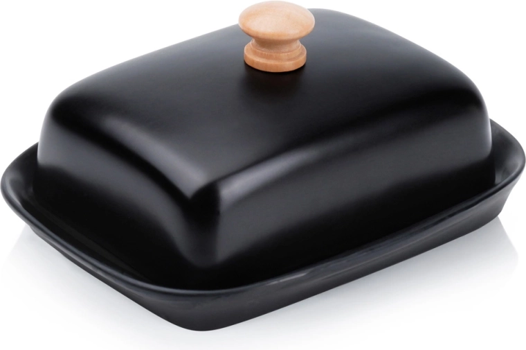 Tato stylová máslenka z kvalitní keramiky v černém provedení je ideální pro každodenní použití doma i při servírování na stole. Dřevěný úchyt na víčku umožňuje pohodlné zvedání, zatímco těsně přiléhající kryt chrání máslo před vysycháním a cizími pachy.