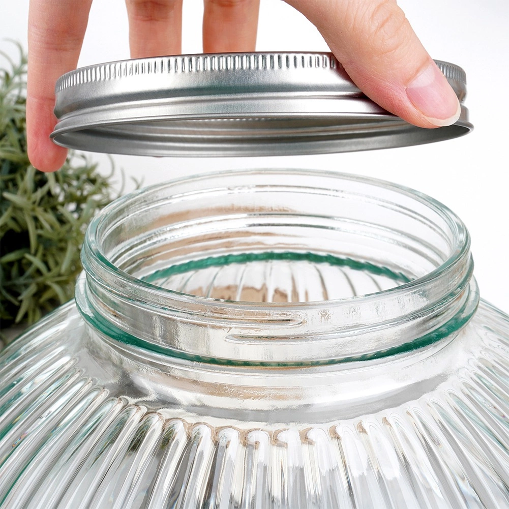 Elegantní skleněný dávkovač nápojů o objemu 5,5 l s kovovým víčkem a praktickým kohoutkem je ideální pro servírování limonády, vody s ovocem, punče či ledového čaje. Robustní žebrované sklo, široké hrdlo pro snadné plnění a čištění a šroubovací víko proti hmyzu dělají z tohoto zásobníku perfektní volbu na zahradní party i domácí oslavy.