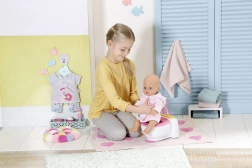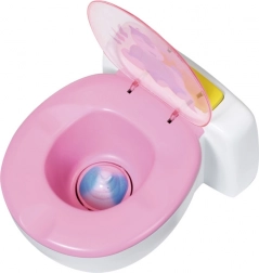 BABY born už chodí na záchod! Jakmile se posadí na svůj bílý trůn s růžovým sedátkem, uslyšíš zvuky čůrání, potlesku a veselého smíchu. BABY born se ale umí i vykakat. V tom případě se v míse objeví barevné třpytivé kakání. Rychle, je čas spláchnout! Když stiskneš splachovací tlačítko, kakání zmizí a uslyšíš zvuky spláchnutí.