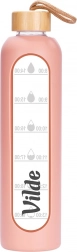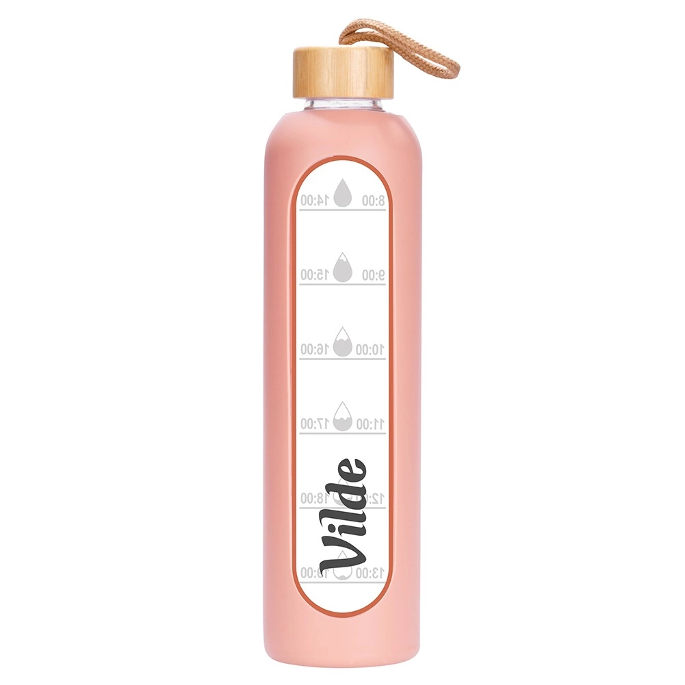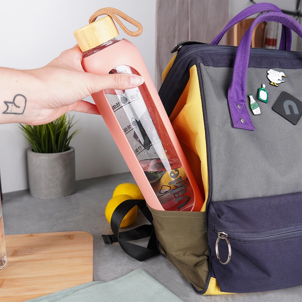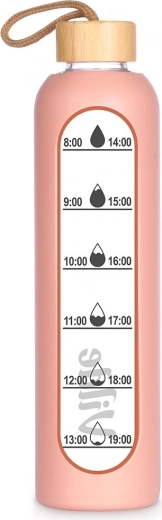 Udržujte si pitný režim stylově. Tato lososově růžová láhev kombinuje elegantní design a praktičnost: odolné borosilikátové sklo, bezpečné bambusové víčko s textilním poutkem a silikonový obal pro jistý úchop a ochranu před rozbitím. Díky časovým značkám snadno sledujete příjem vody během celého dne.
