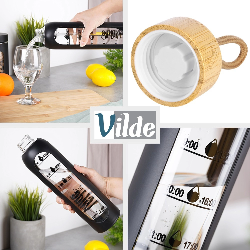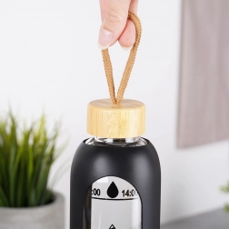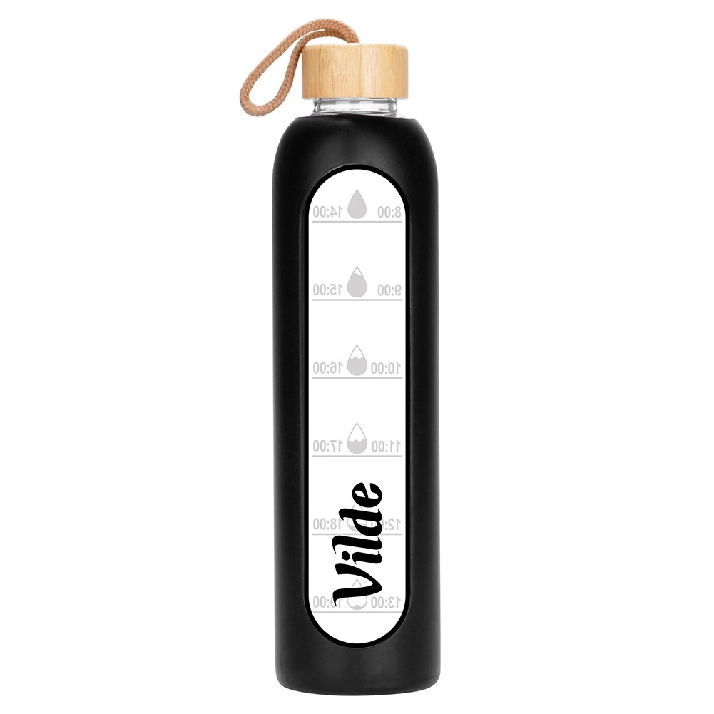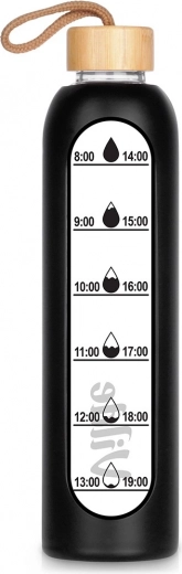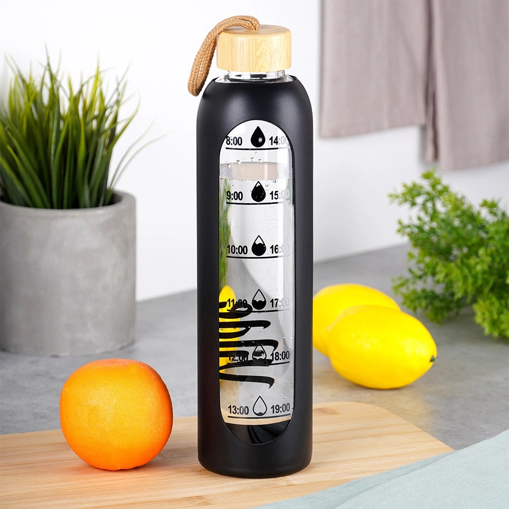 Udržujte si hydrataci stylově i na cestách. Tato elegantní skleněná láhev 1 l s černým silikonovým obalem a bambusovým šroubovacím víčkem je ideální na vodu, domácí limonády, džusy, smoothie i koktejly. Časové značky od rána do večera vás jemně povedou k pravidelnému pití.