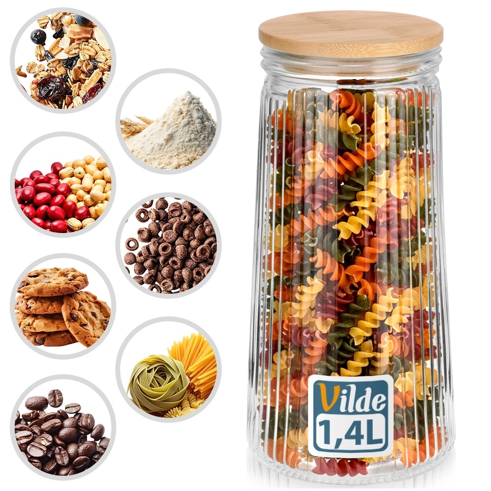 Udržte svou spižírnu přehlednou a potraviny déle čerstvé. Skleněná dóza o objemu 1,4 l kombinuje borosilikátové sklo s bambusovým víčkem a silikonovým těsněním pro spolehlivou vzduchotěsnost. Průhledné tělo s vertikálním rýhováním dodává moderní vzhled a umožňuje okamžitou kontrolu obsahu.