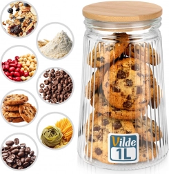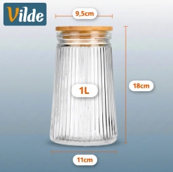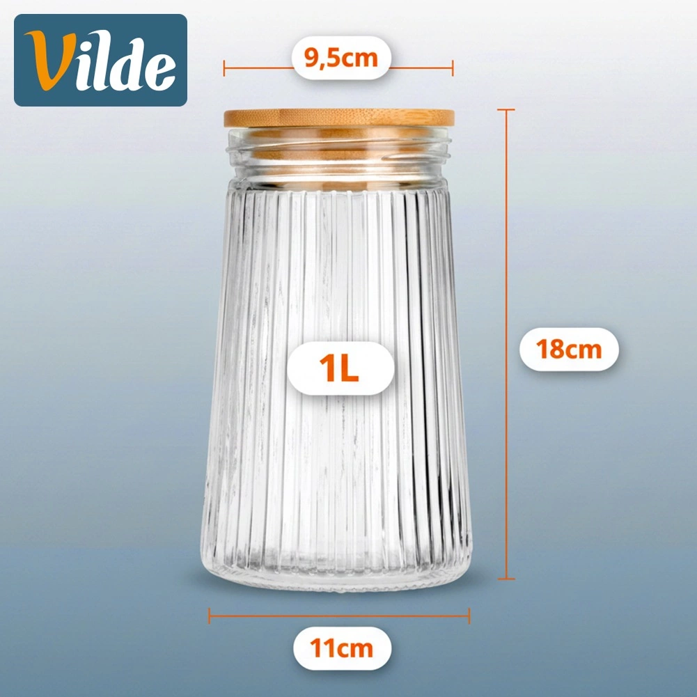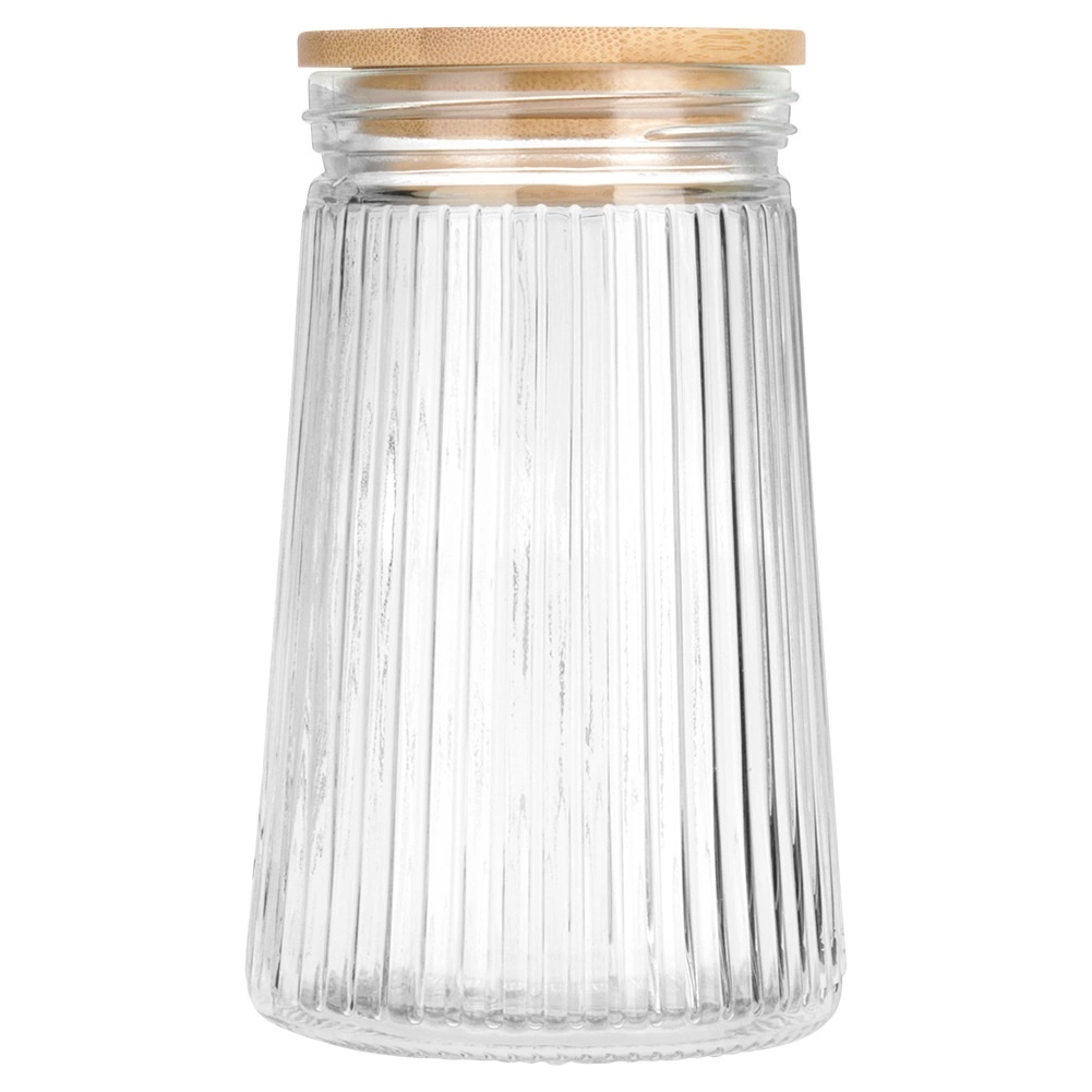 Stylová skleněná dóza o objemu 1 l s bambusovým víčkem a silikonovým těsněním udrží vaše potraviny déle čerstvé. Díky transparentnímu žebrovanému sklu máte obsah stále pod kontrolou a kuchyň zároveň působí upraveně a elegantně. Ideální pro kávu, cukroví, těstoviny, müsli či jiné sypké potraviny. Odolné borosilikátové sklo a vzduchotěsný uzávěr zaručují svěžest i aroma.