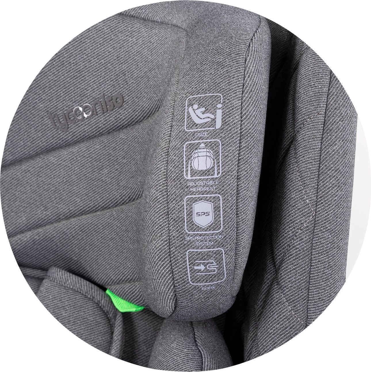 Bezpečí zajišťuje pokročilý SPS – Side Protection System pro boční nárazy, 5bodový bezpečnostní pás s měkkými chrániči a konstrukce testovaná dle ECE R129 i-Size včetně čelních, zadních i bočních nárazů. Komfort podporuje nastavitelná opěrka hlavy, měkké polstrování, prodyšné textilie a snadno snímatelný, pratelný potah. Součástí je i praktický držák nápoje.
