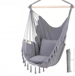 Elegantní závěsné houpací křeslo v neutrální šedé barvě přináší do každého prostoru pocit klidu a lehkosti. Přírodní bavlněná tkanina je prodyšná, měkká na dotek a odolná pro každodenní používání. Díky jemnému houpání účinně uvolňuje tělo i mysl – ideální po náročném dni.
