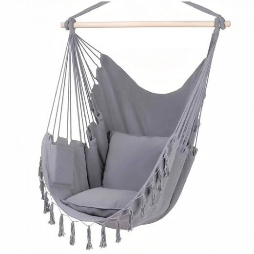 Široké sedadlo, vícebodové zavěšení a dřevěná rozpěrná tyč zajišťují stabilitu a příjemné posezení. Křeslo snadno zavěsíte doma, na balkoně či na zahradě a vytvoříte si tak vlastní relaxační koutek. Praktické boční kapsy pojmou knihu, telefon nebo drobnosti, které chcete mít po ruce.