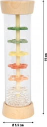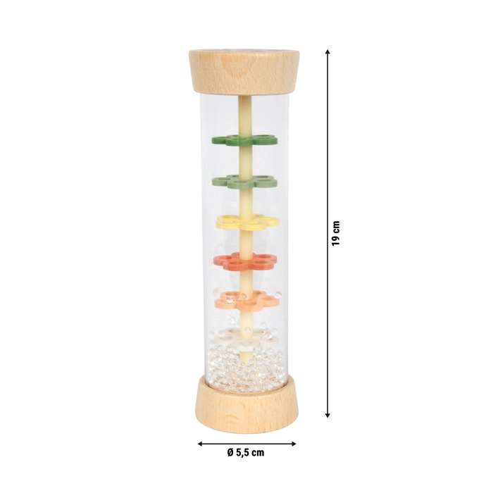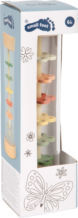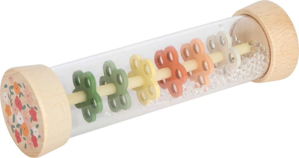Dešťová hůlka Malí přátelé přináší dětem kouzlo padajících kapek přímo do jejich rukou. Třpytivé korálky se pomalu sypou skrz barevné květinové destičky v průhledné trubici a vytvářejí rovnoměrný, relaxační zvuk. Ideální pro chvíle zklidnění, pro první rytmické pokusy i jako barevné chrastítko.