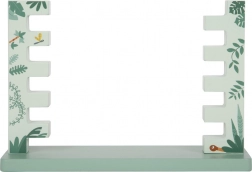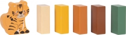 - Barevné dřevěné cihličky, rám se základnou, 2 dřevěné paličky, figurka tygříka