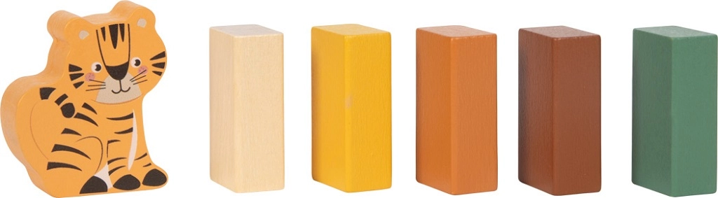 Barevné cihličky, stabilní rám, dvě paličky a figurka tygra – vše ze 100% FSC® dřeva s hladkým povrchem.
