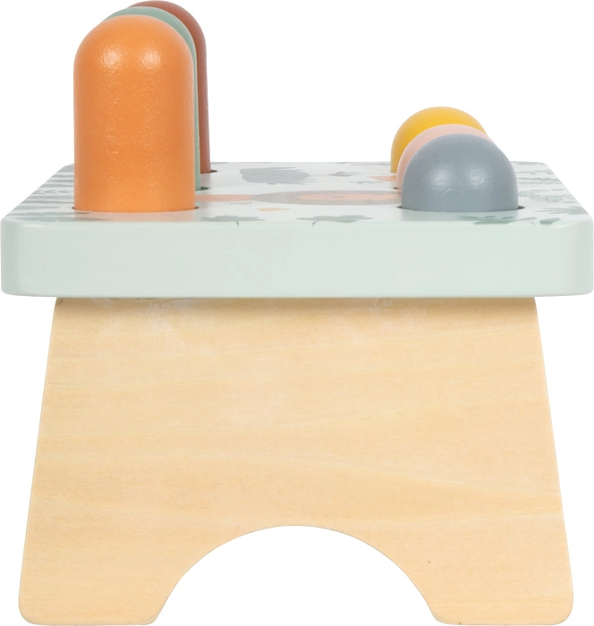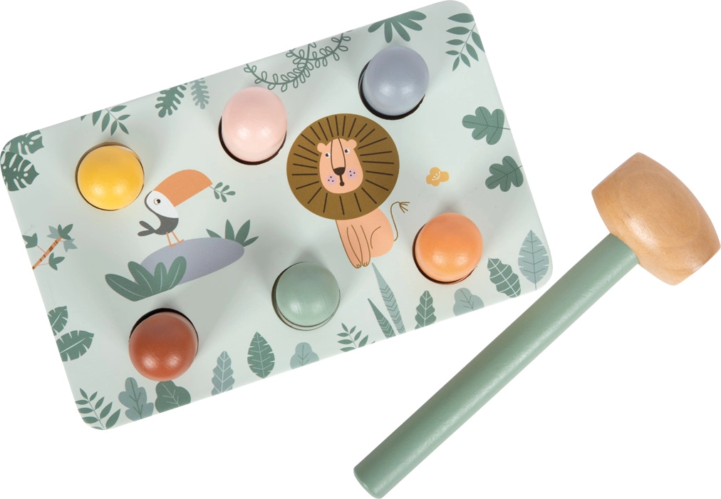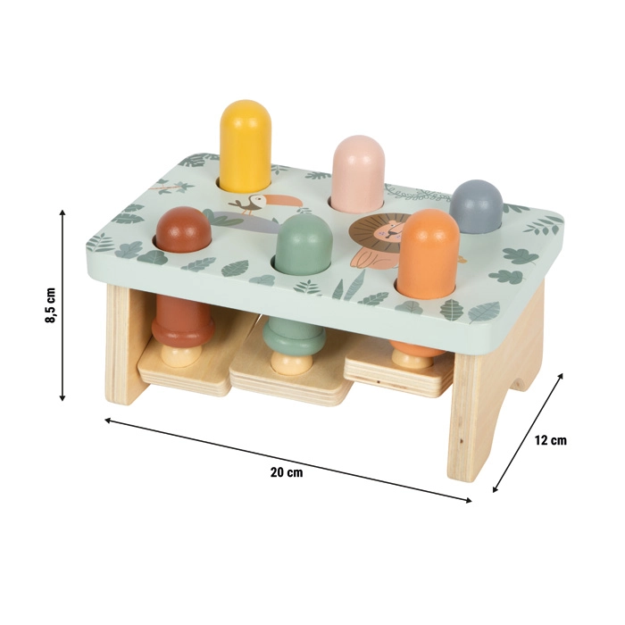 Objevte hravou zatloukací lavičku v motivu safari od small foot ze 100% FSC certifikovaného dřeva. Děti pomocí kladívka zatloukají kolíčky a zažijí překvapivý moment: když jeden kolík zmizí, druhý na opačné straně vyskočí! Hračka s roztomilými zvířecími motivy, hladkými zaoblenými hranami a pevnou dřevěnou konstrukcí podporuje jemnou motoriku, koordinaci oko–ruka a pochopení příčiny a následku.