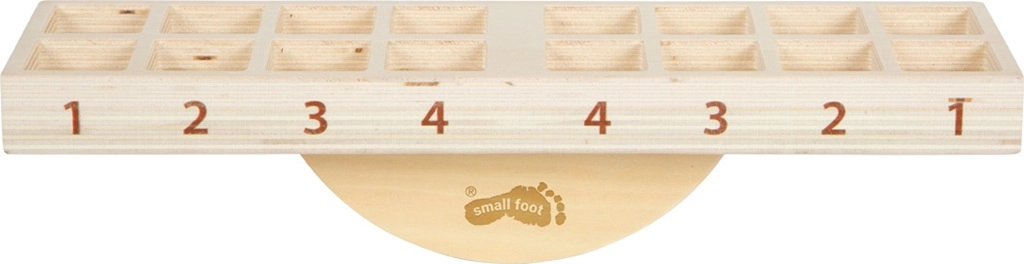 Číslovaná balanční deska na půlkruhové základně umožňuje dětem experimentovat s rozmístěním bloků a okamžitě vidět dopad na rovnováhu.