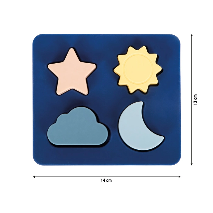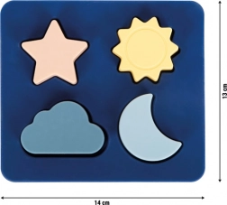 Roztomilé dětské puzzle ze 100% potravinářského silikonu bez BPA přináší bezpečné a zábavné učení pro nejmenší. Obsahuje 4 dílky ve tvaru slunce, měsíce, hvězdy a mráčku, které lze vkládat z různých stran. Hračka je měkká, nerozbitná, netoxická, snadno omyvatelná a ideální pro hraní doma, ve vodě i v písku – perfektní na cesty a pro rozvoj jemné motoriky a smyslového vnímání.