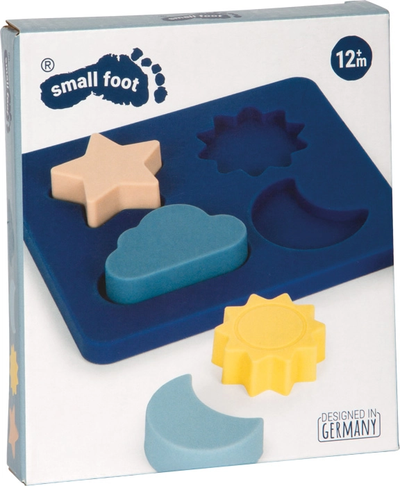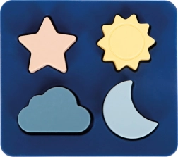 Silikonové puzzle small foot je navržené pro malé ručičky a zvídavé hlavičky. Čtyři pastelové tvary – slunce, měsíc, hvězda a mráček – děti snadno uchopí a vloží do podložky z různých stran, což podporuje kreativitu a přirozené učení tvarů a barev. Materiál z potravinářského silikonu bez BPA je jemný na dotek, bez zápachu a naprosto bezpečný i při kontaktu s ústy.