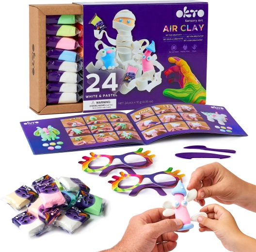 Sada OKTO přináší vše, co potřebujete k okamžitému tvoření – od pestré palety barev po užitečné nástroje a návod. Hmota je lehká, příjemná na dotek a po otevření připravena k použití. Po vytvarování jednoduše necháte výrobky přirozeně uschnout.