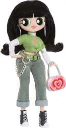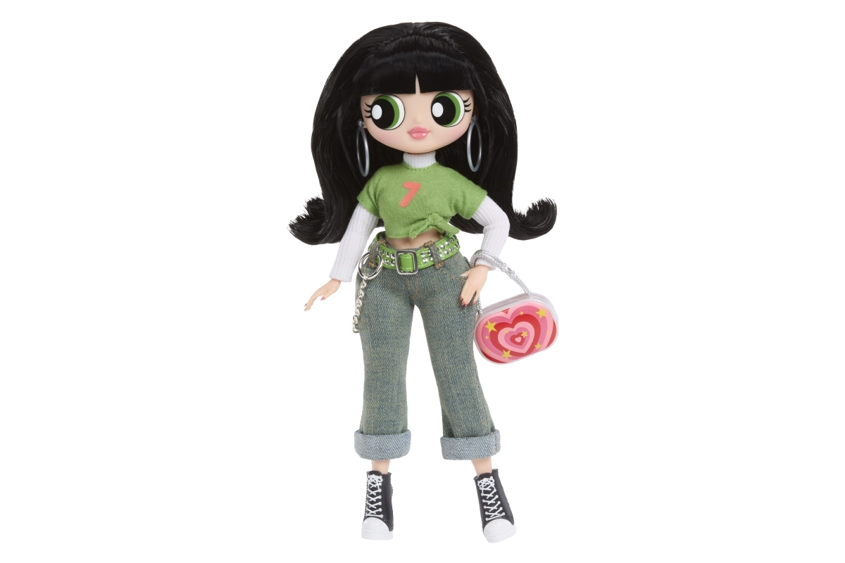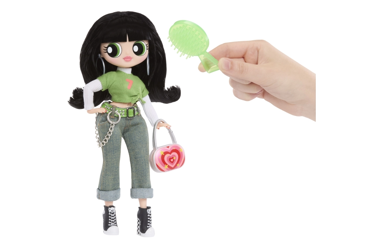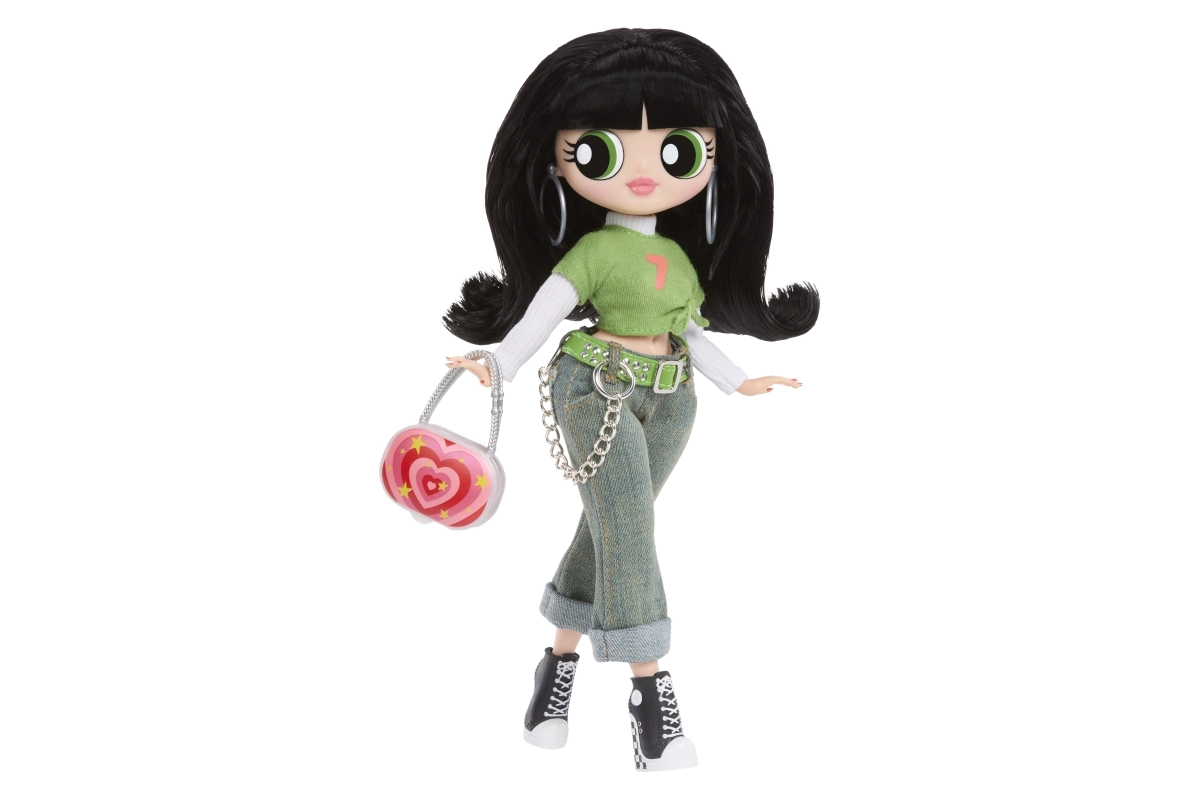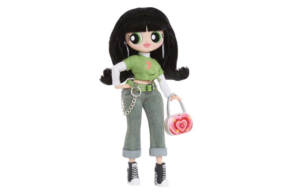 Zelený crop top, džíny s řetízkem a černé tenisky doplňuje výrazná kabelka a náušnice – ikonický vzhled Buttercup v L.O.L. provedení.