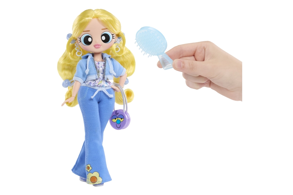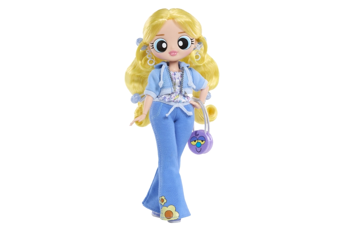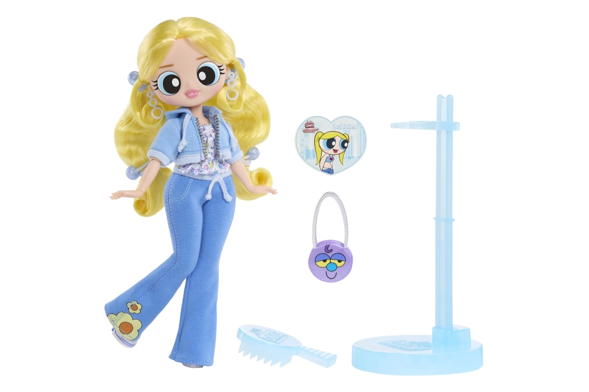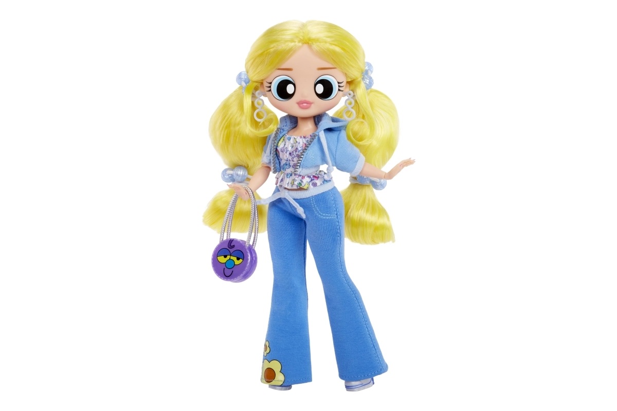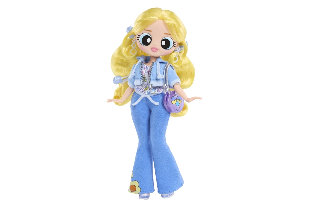 Bubbles přichází v modrém outfitu s květinovými prvky a ikonickou kabelkou – ideální pro módní příběhy a sbírání.