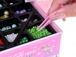 Šperkovnice nabízí tři přehledné úrovně: nahoře velké zrcátko a přihrádky pro prstýnky, náušnice a doplňky k náramku a řetízku, uprostřed barevné korálky různých tvarů a velikostí pro snadné navlékání a dole ozdoby do vlasů – gumičky, sponky a mašličky pro doladění stylingu. Díky elastičnímu silonu a pinzetě je navlékání pohodlné i pro začátečníky.
