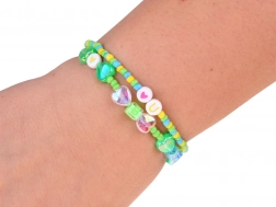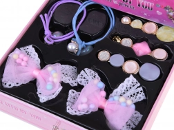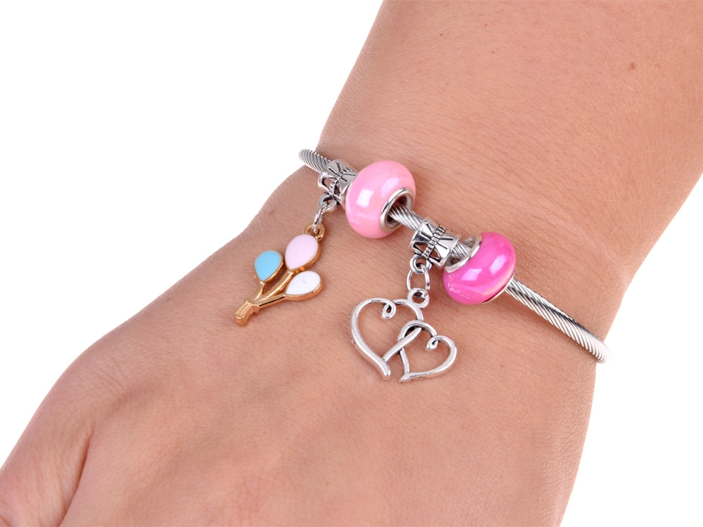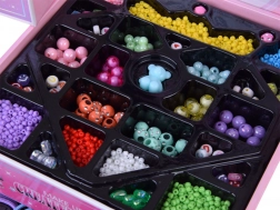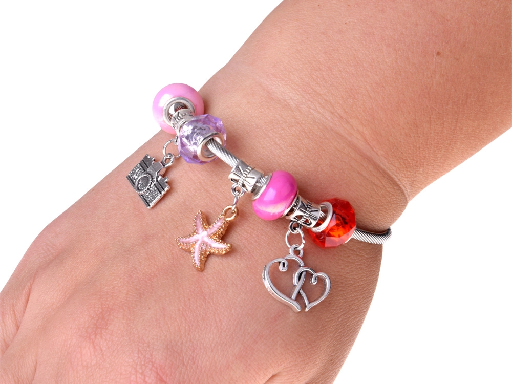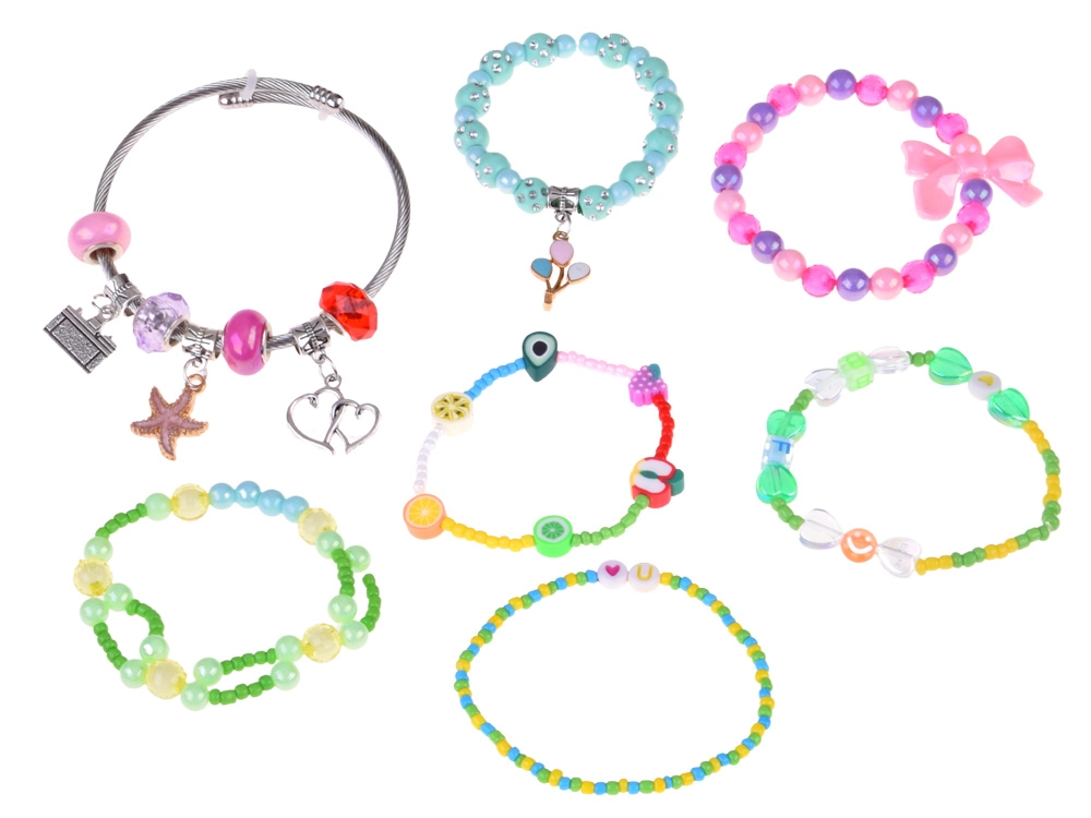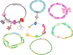 - Kompletní příslušenství: korálky, přívěsky, kovový náramek, řetízek, náušnice-klipsy, 2 prstýnky, elastická šňůrka, pinzeta, gumičky, sponky, mašličky