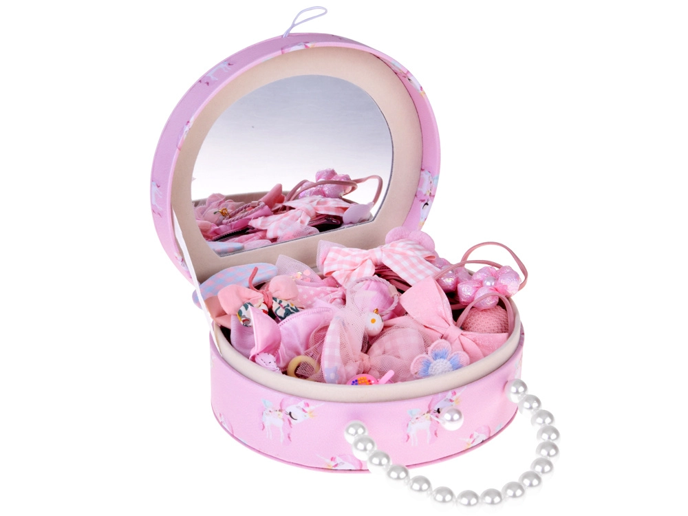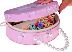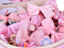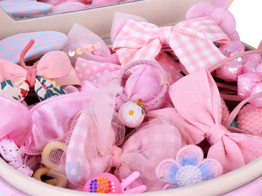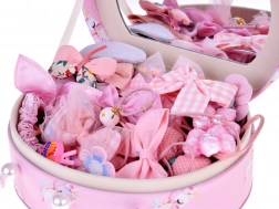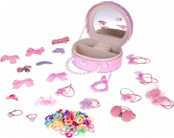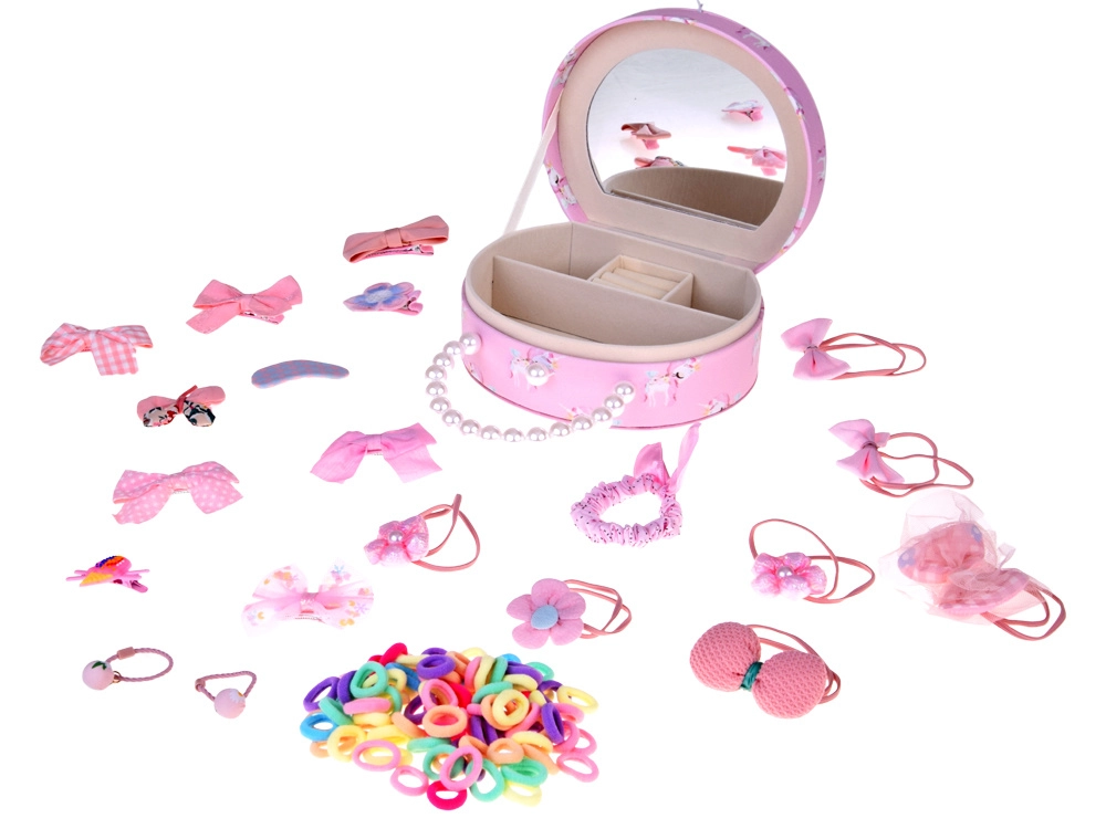 Bohatý set doplňků podporuje kreativní česání i stylové zdobení vlasů. Najdete zde 10 různých sponek (mašličky, motýlek, kytičky, ovál), 10 ozdobných gumiček (s kvítkem, mašlí, bambulkou či oušky) a přibližně 100 mini gumiček v pestrých barvách. Nechybí ani perličkový náhrdelník pro doladění outfitu.