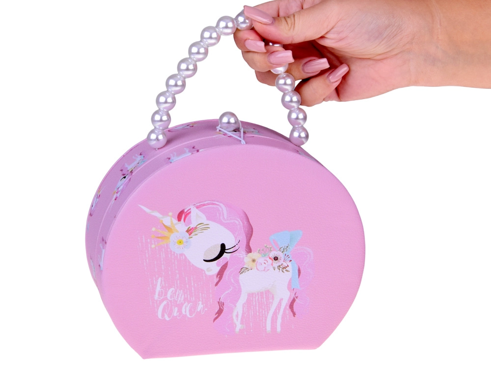Elegantní oválná šperkovnice z eko kůže v jemné růžové barvě zdobená jednorožcem je ideální pro ukládání dětské bižuterie a vlasových doplňků. Uvnitř se nachází integrované zrcátko, měkké polstrování a 3 přihrádky (2 malé a 1 velká) včetně místa na prstýnky. Perlové držadlo usnadní přenášení na návštěvy či přespání u kamarádky.