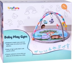 Dva polstrované, pružné oblouky se závěsnými plyšovými hračkami a zrcátkem motivují miminko k natahování, uchopování a kopání – ideální pro trénink koordinace oko–ruka a posílení svalů.