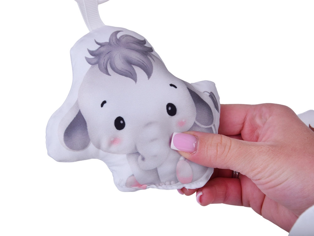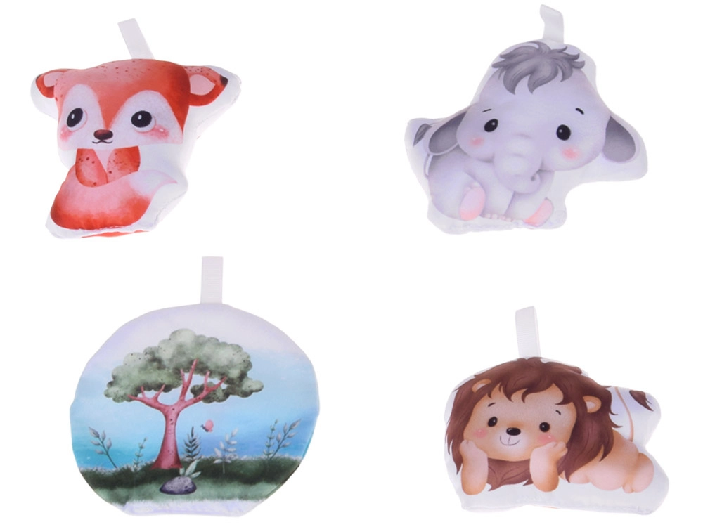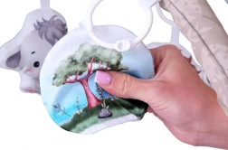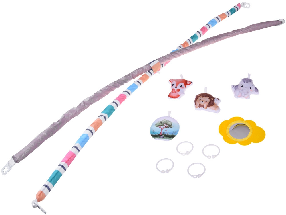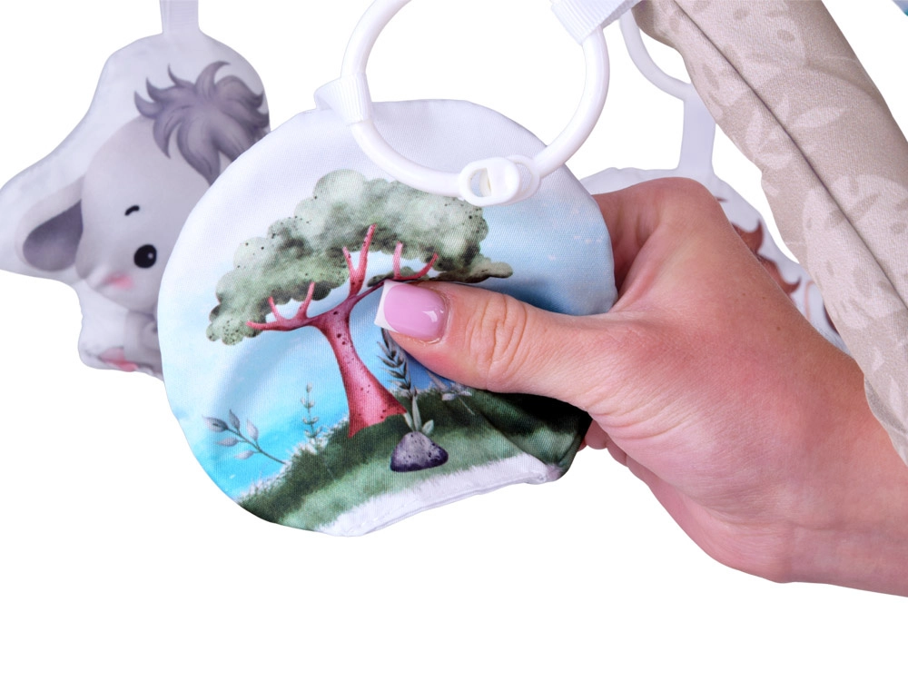Roztomilý lišáček, lvíček, sloník, šustící stromeček a bezpečné zrcátko lze snadno přemístit či odepnout. Dítě tak poznává různé tvary, struktury i zvuky a trénuje jemnou motoriku.