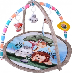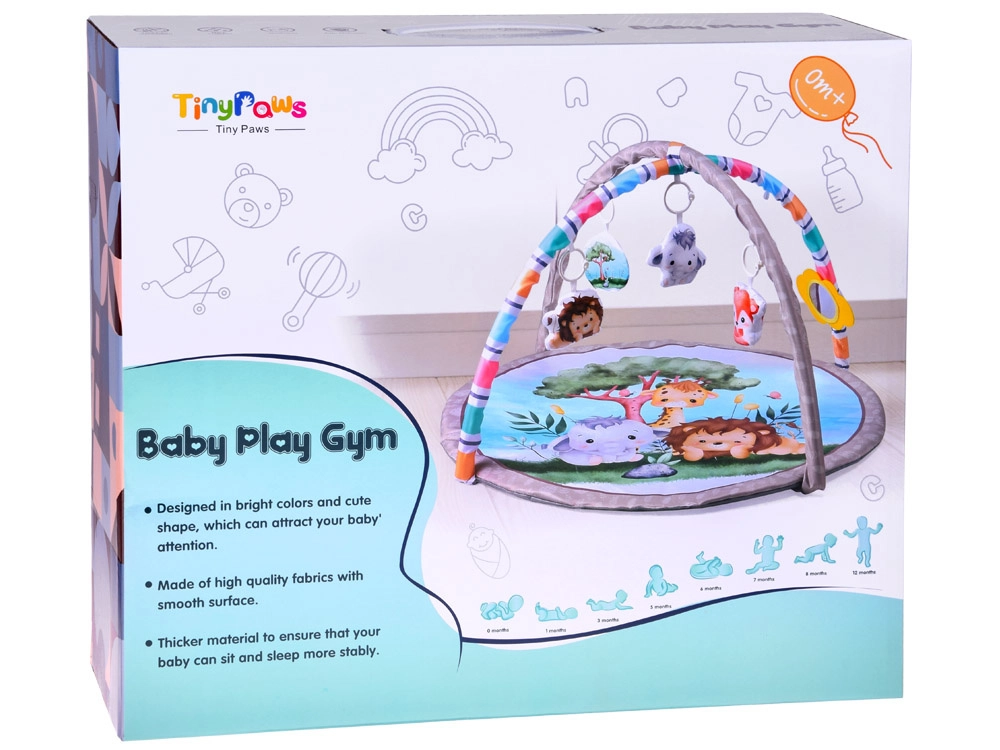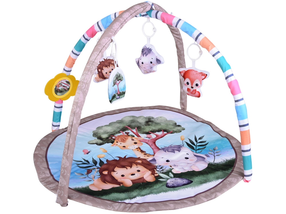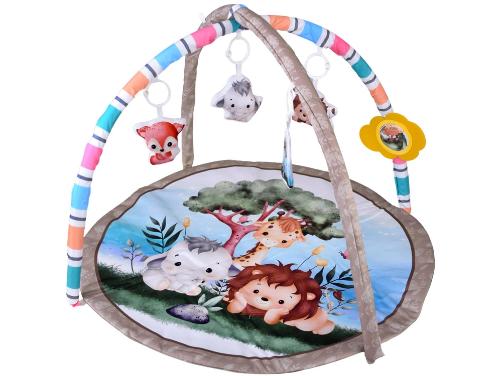 Tato okrouhlá edukační podložka se safari motivy (lev, slon, žirafa) nabízí měkké a útulné prostředí, které podněcuje zvědavost a samostatné objevování. Dva polstrované křížené oblouky se závěsnými hračkami a bezpečným nezničitelným zrcátkem lákají miminko k natahování, chytání a kopání, čímž podporují hrubou i jemnou motoriku.