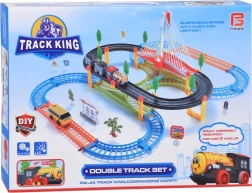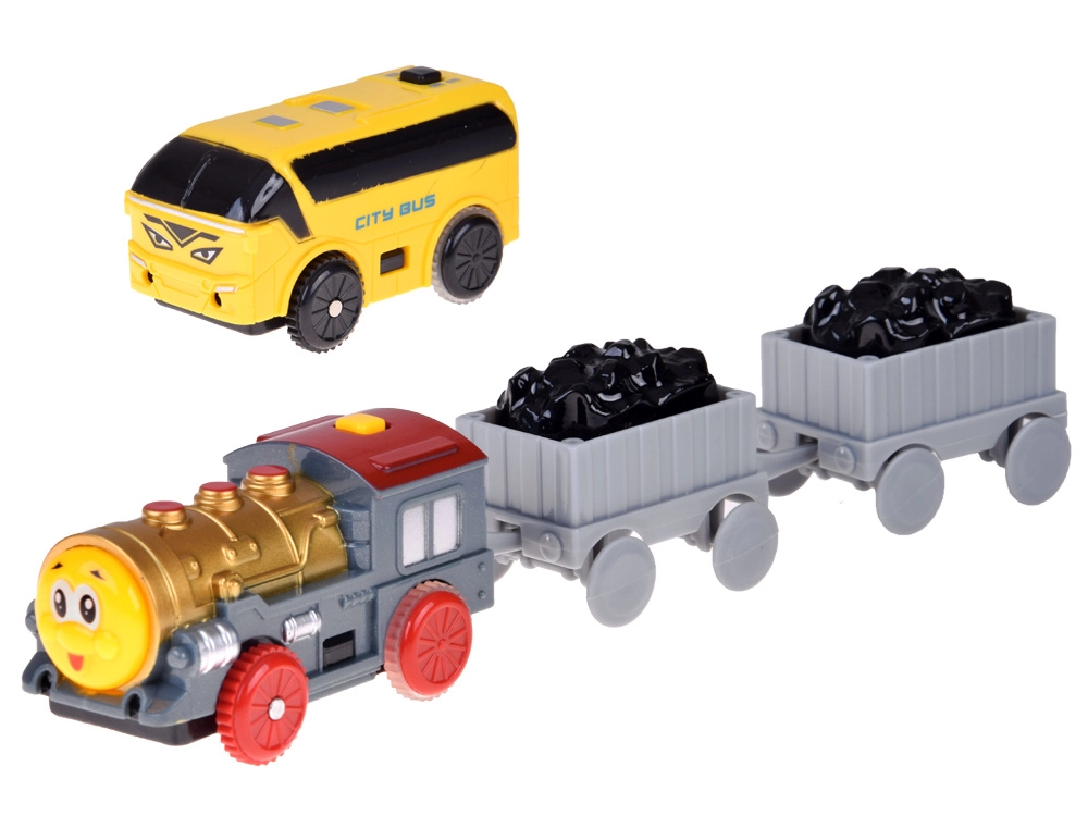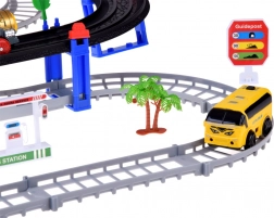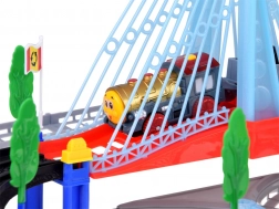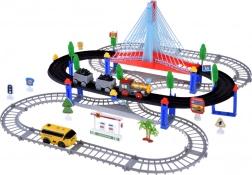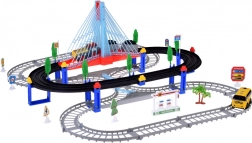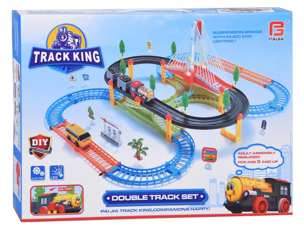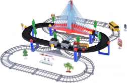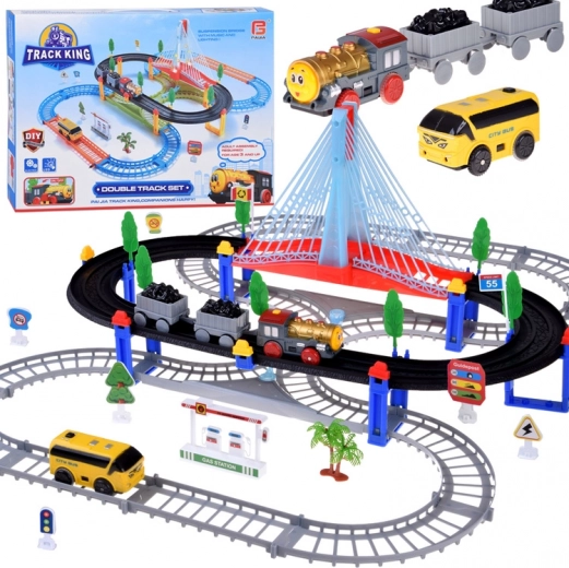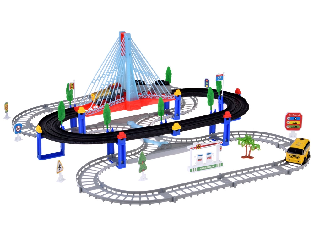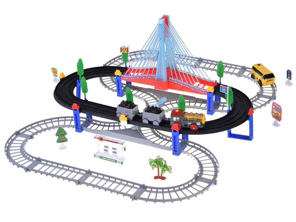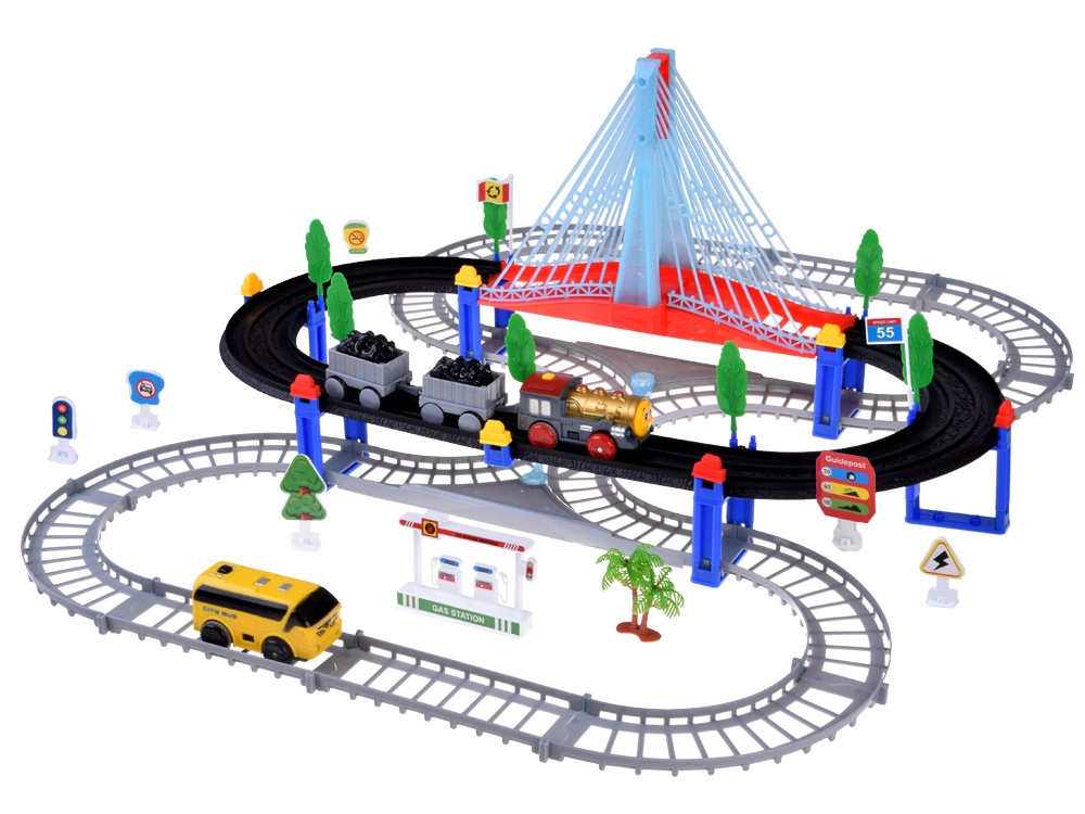 Tato elektrická vláčkodráha s víceúrovňovými kolejemi a závěsným mostem přináší dětem hodiny tvořivé hry. Lokomotiva s vagony a žlutý městský autobus se pohybují po propojených tratích, přejíždějí přes most a míjejí dopravní značení, stromečky i malou benzínovou stanici. LED osvětlení a zvuky lokomotivy s melodiemi dodávají hře na autentičnosti.