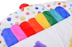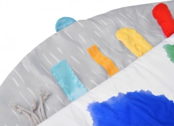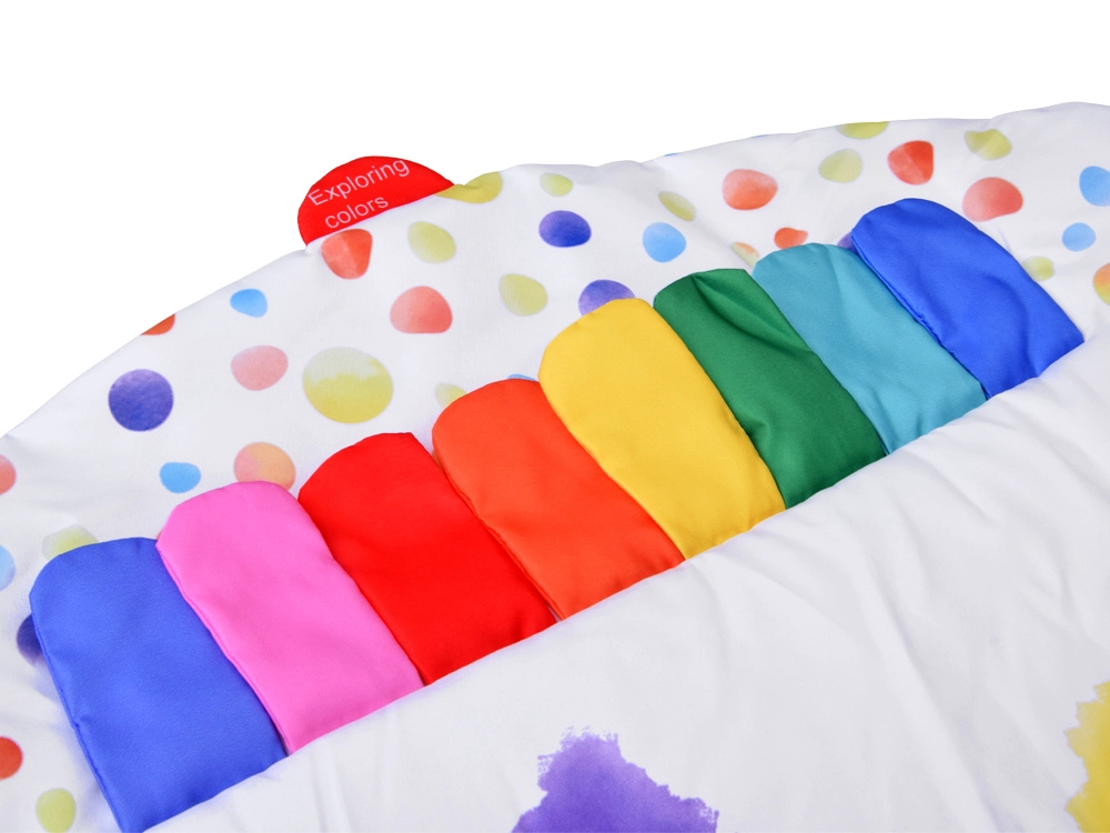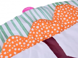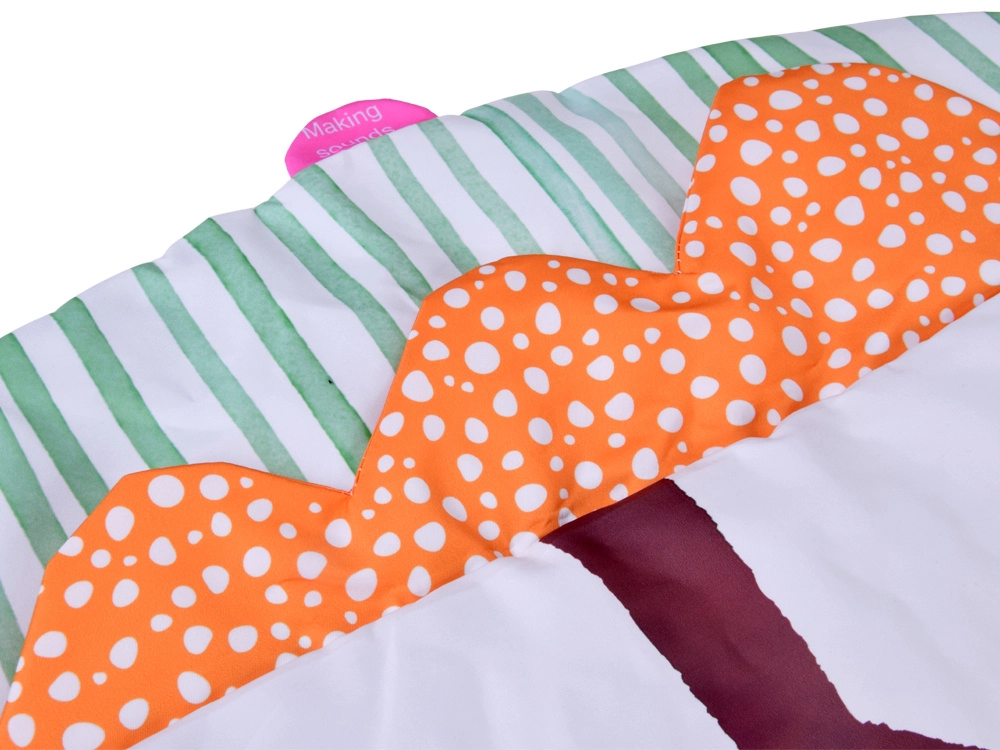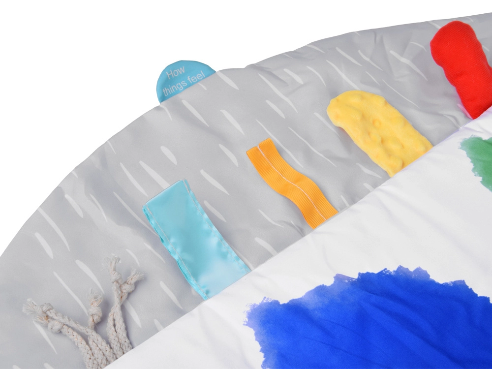 Tato velká, kruhová dětská podložka nabízí pohodlný, polstrovaný povrch a variabilní použití: jako hrací hnízdo s oblouky pro zavěšení hraček nebo jako samostatná podložka pro volnou hru a cvičení na bříšku. Vysoký kontrast vzorů, různorodé textury a jemné zvuky přirozeně stimulují smysly a rozvíjejí jemnou i hrubou motoriku.