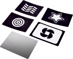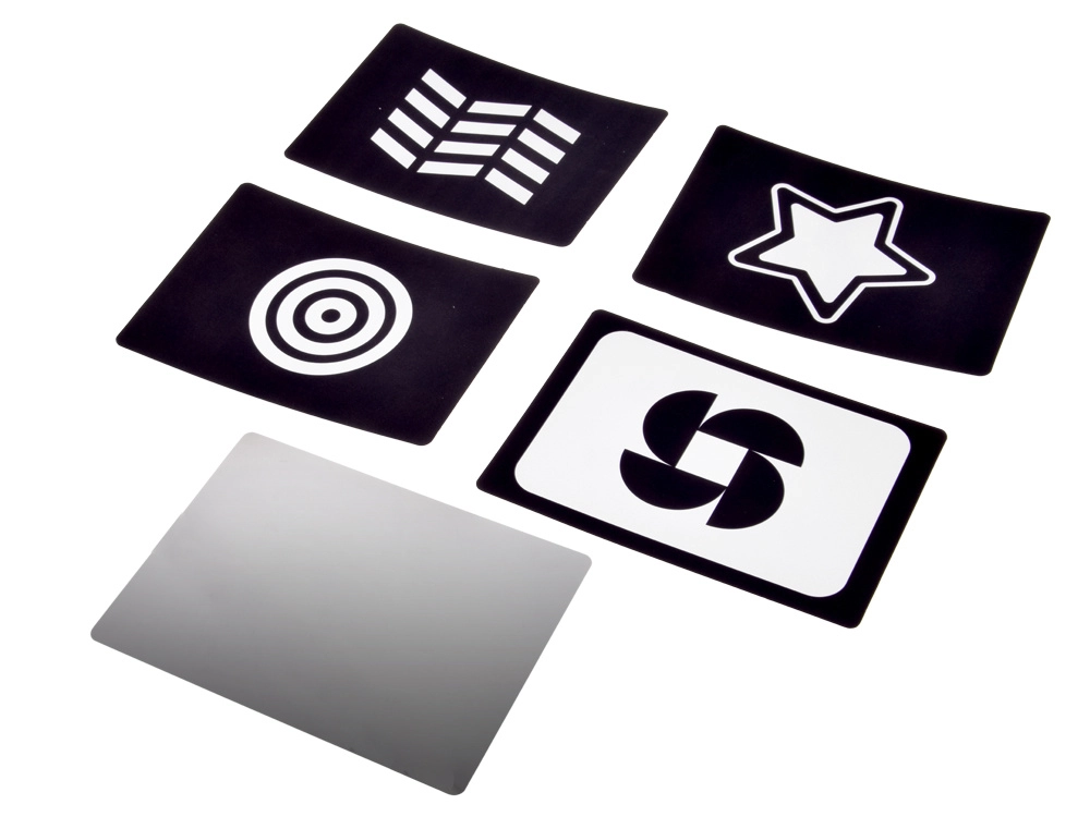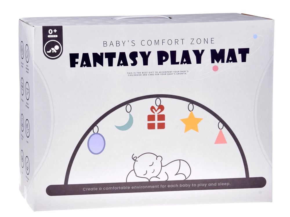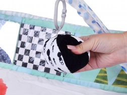 - Podložka, 2 oblouky, sada závěsných hraček: zrcátko, kontrastní karty, kousátka (hvězdičky), měkký kontrastní míček, chrastítko, šustící prvky