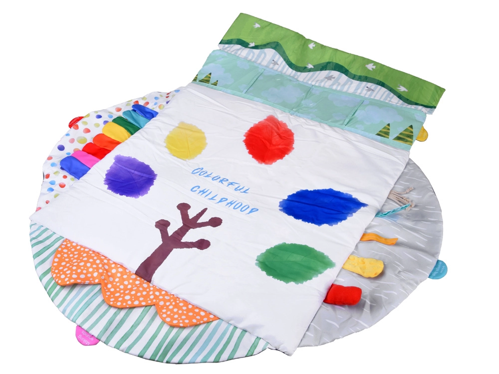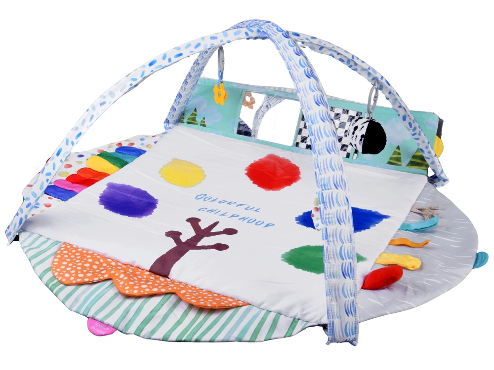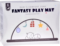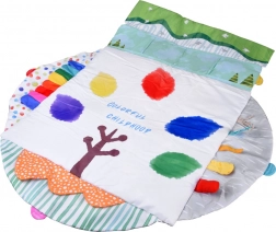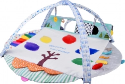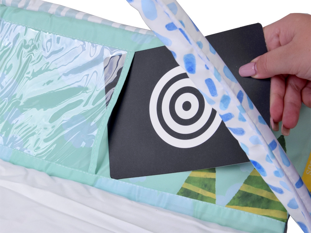 Součástí je pestrá sada doplňků: zrcátko pro sebepoznávání, kontrastní karty pro vizuální rozvoj, plyšové závěsky, kousátka, chrastítko i šustící detaily. Podložka se rychle složí, je lehká na přenášení a snadno se udržuje v čistotě – ideální doma i na cesty.