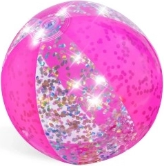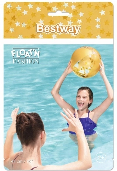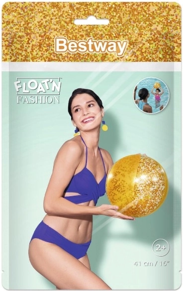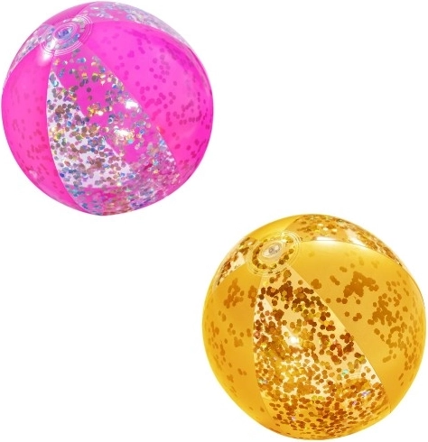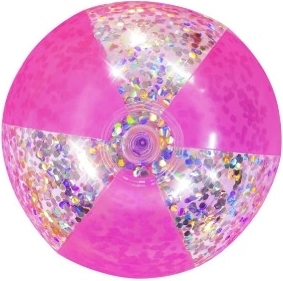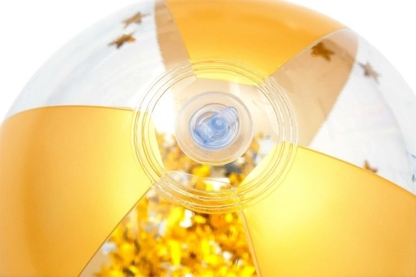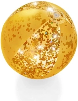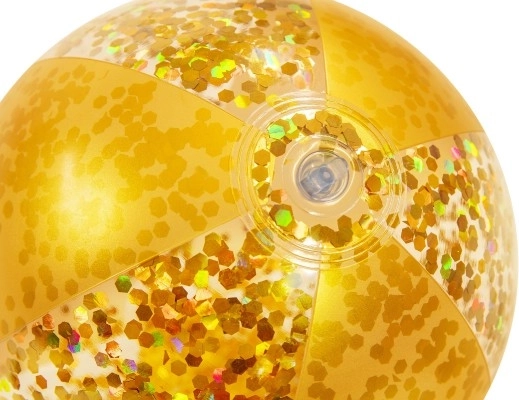 Stylový nafukovací plážový míč se zlatým třpytem přinese spoustu zábavy u vody. Transparentní panely plné třpytek vytvářejí efektní lesk na slunci, míč je lehce nafukovací a díky bezpečnostnímu ventilu dobře drží vzduch. Ideální na bazén, pláž i zahradu.