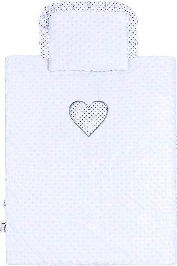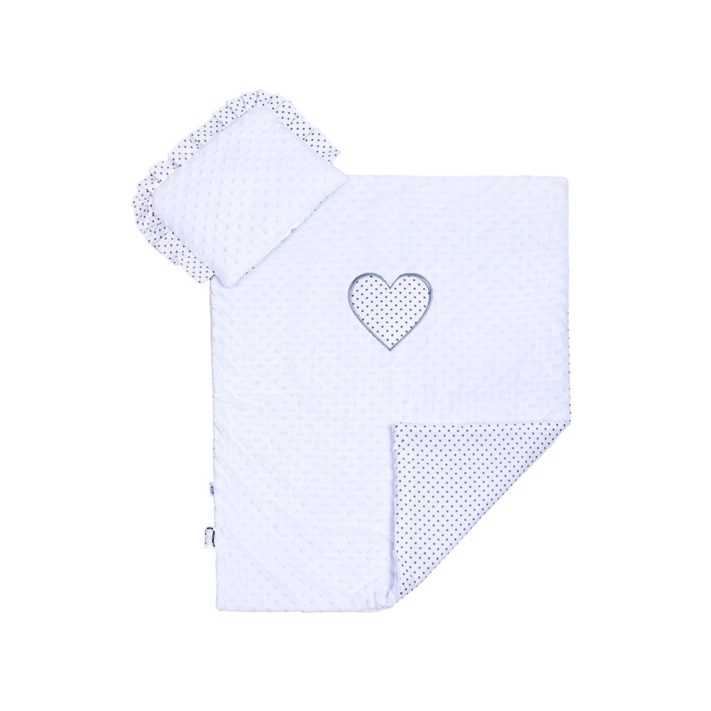 Dekorativní volánek na vankúšku a puntíkované srdíčko na přikrývce dodají kočárku i postýlce něžný, čistý vzhled.